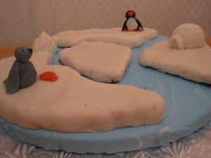 I baked two large round sugar cookies with a bottomless, adjustable cake pan. I flooded one of them with blue royal icing (link to the sugar cookie and royal icing recipes here) to represent the water and I cut the other one into several jaggedly edged pieces. I covered the individual pieces with white fondant to represent sheets of ice floating on the water. Then I used the gumpaste, edible glue, and icing colours to make a miniature penguin, seal, fish, igloo, and iceberg.