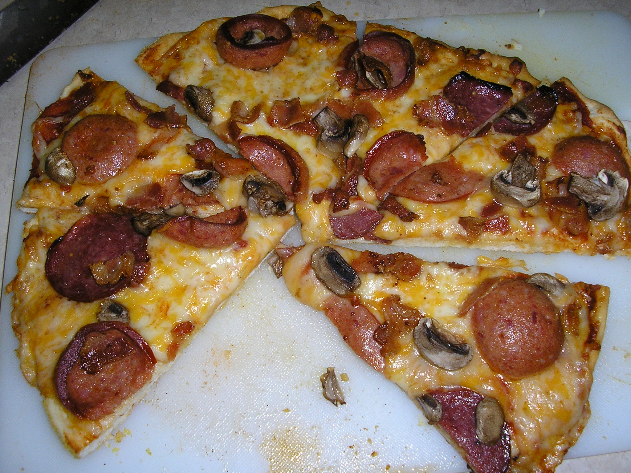 – hot italian sausage, pepperoni, tomato sauce, bacon strips, dried chilli flakes