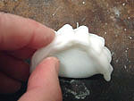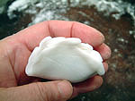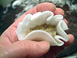 Sift the dry ingredients of the dough into a mixing bowl and pour in the boiling water and oil (if using), stirring until you get a paste. Let dough stand at room temperature for 1 minute, then add the lard or shortening and knead in into a soft dough. Knead for no more than 2 minutes. (You may need to adjust the wheat starch or water for the right texture.) Let it sit at room temperature for 20 minutes, loosely covered with a cloth. Roll it into a long cylinder and cut it into 32 equally sized pieces. Cover with a slightly damp cloth and work with one piece at a time. Roll each piece of the dough into a ball. Using the flat side of a cleaver (or the palm of your hand or the bottom of a flat pot), flatten the dough ball between two sheets of wax paper (or syran wrap) until it is about 3 ½ inches in diameter. The dough should be thin. In your hands, make 4 – 8 slightly overlapping pleats in the top half of the dough round. This forms the shape of a cup with the bottom half still having the smooth edge. (See below for pictures that show you how to wrap ha gow). Put 1 teaspoon of filling into the cup shape and pinch together the top half of the dough round (pleated half) with the bottom half of the dough round (smooth half), closing the dumpling. (See below for pictures that show you how to wrap shrimp dumplings).