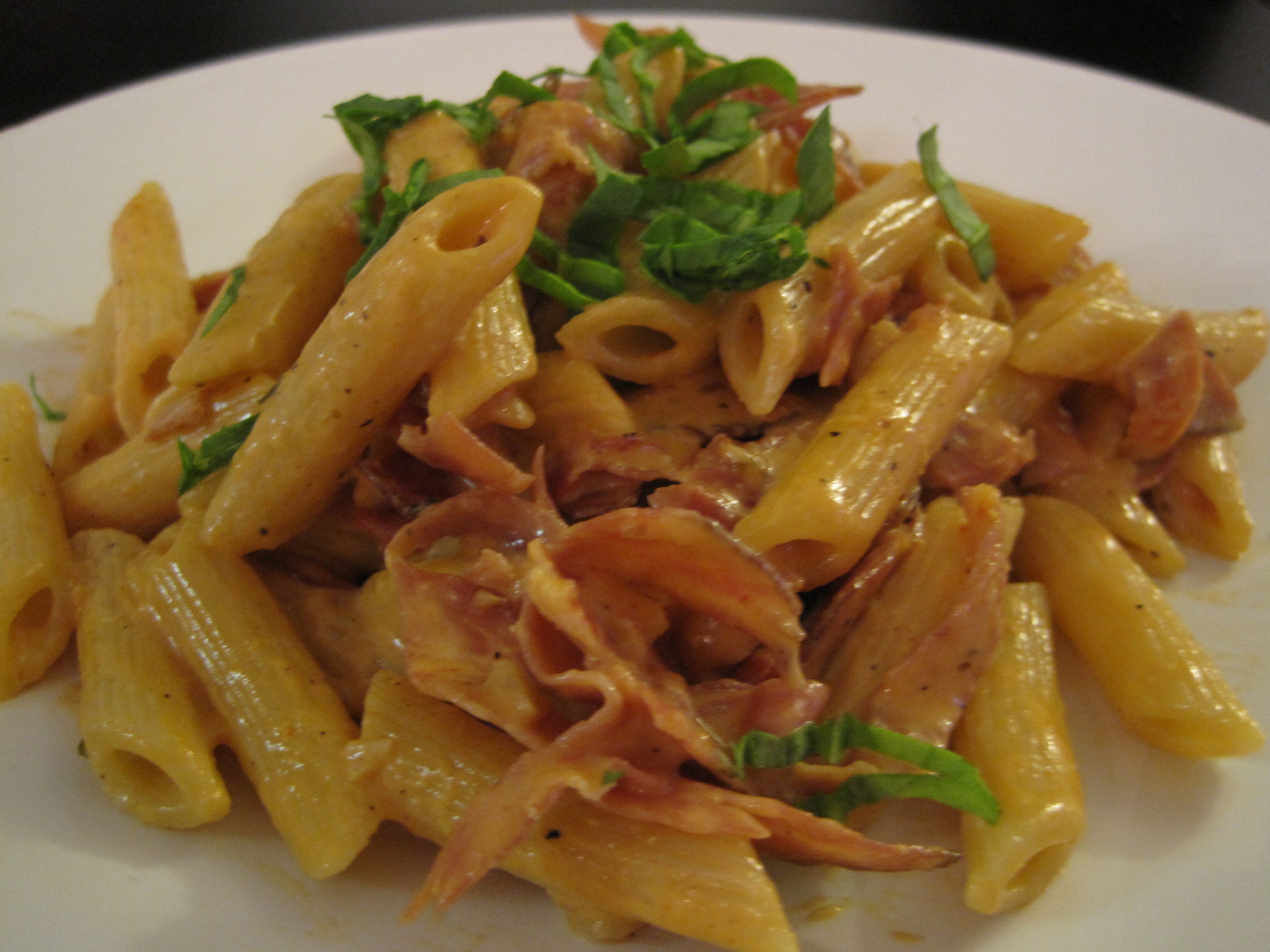 Bring a pot of salted water to boil over high heat.  Add the pasta and cook uncovered until al dente for 8 to 10 minutes.  Meanwhile, over medium heat, heat 1 tbsp olive oil in a large saute pan.  Add the garlic and cook for 30 seconds to 1 minute.  Add the prosciutto and cook, stirring for 2 minutes.  Add the vodka.  Very carefully, using a lit match, tilt the pan slightly and light the vodka on fire at the very edge of the pan keeping your hands as far away from the pan as possible.  Be very careful, as the flames spread immediately and come up quite high.  Holding the handle of the pan, shake the pan gently back and forth until all of the vodka is burnt off and the fire goes out by itself.  Be careful not to spill any of the vodka from the pan.  The edges of the prosciutto will be nicely crisp.  Then add the cream and simmer for 1 minute.  Add the tomato sauce and pepper to taste and stir for 1 minute.  Then add the drained pasta, mix well, and serve immediately with sliced fresh basil as garnish.