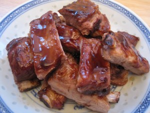 Hoisin sauce is a very popular Chinese sauce that goes really well with chicken, pork, or beef.  It is also the dipping sauce for peking duck and deep fried dough sticks wrapped in rice noodle.  I use it on baked pork ribs more than anything else.  Although marinating the ribs makes the meat more flavourful, the hoisin sauce has enough flavour that you really don’t have to.  So this is the perfect quick and ridiculously easy meal that doesn’t require any pre-planning and only requires 2 ingredients.  I make this often for guests too, because I’ve yet to meet someone who didn’t like them.  If you don’t like/eat pork, hoisin baked chicken is really good too.  When asked what he wanted me to make for Valentine’s Day dinner, 2011, Ed requested these hoisin ribs.  🙂