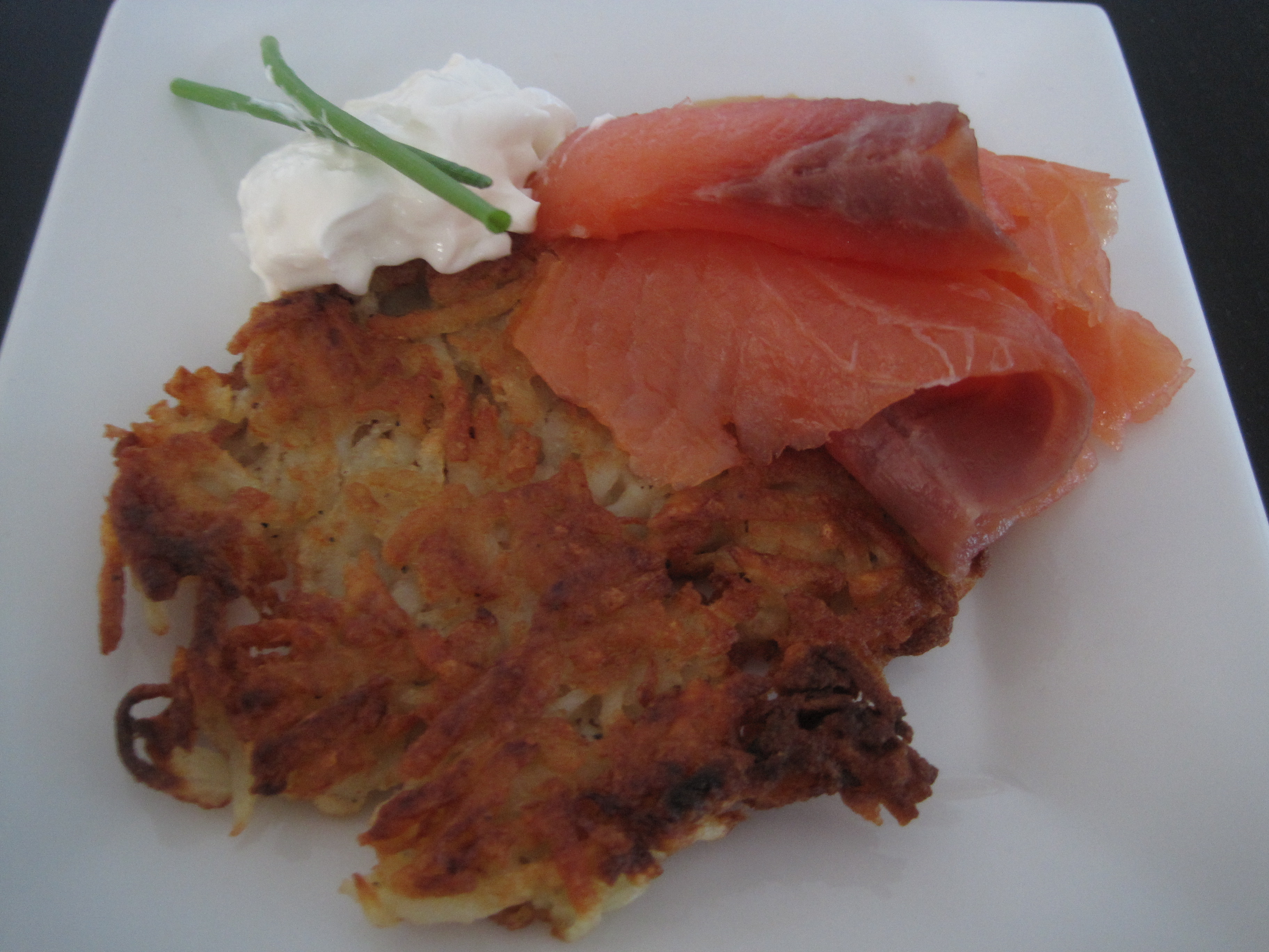 Potato pancakes (also called potato latkes) can be made bite sized for hors d’oeuvres or medium to large for appetizers. I like topping these with caviar for hors d’oeuvres or with smoked salmon for appetizers, served with sour cream and garnished with chives.