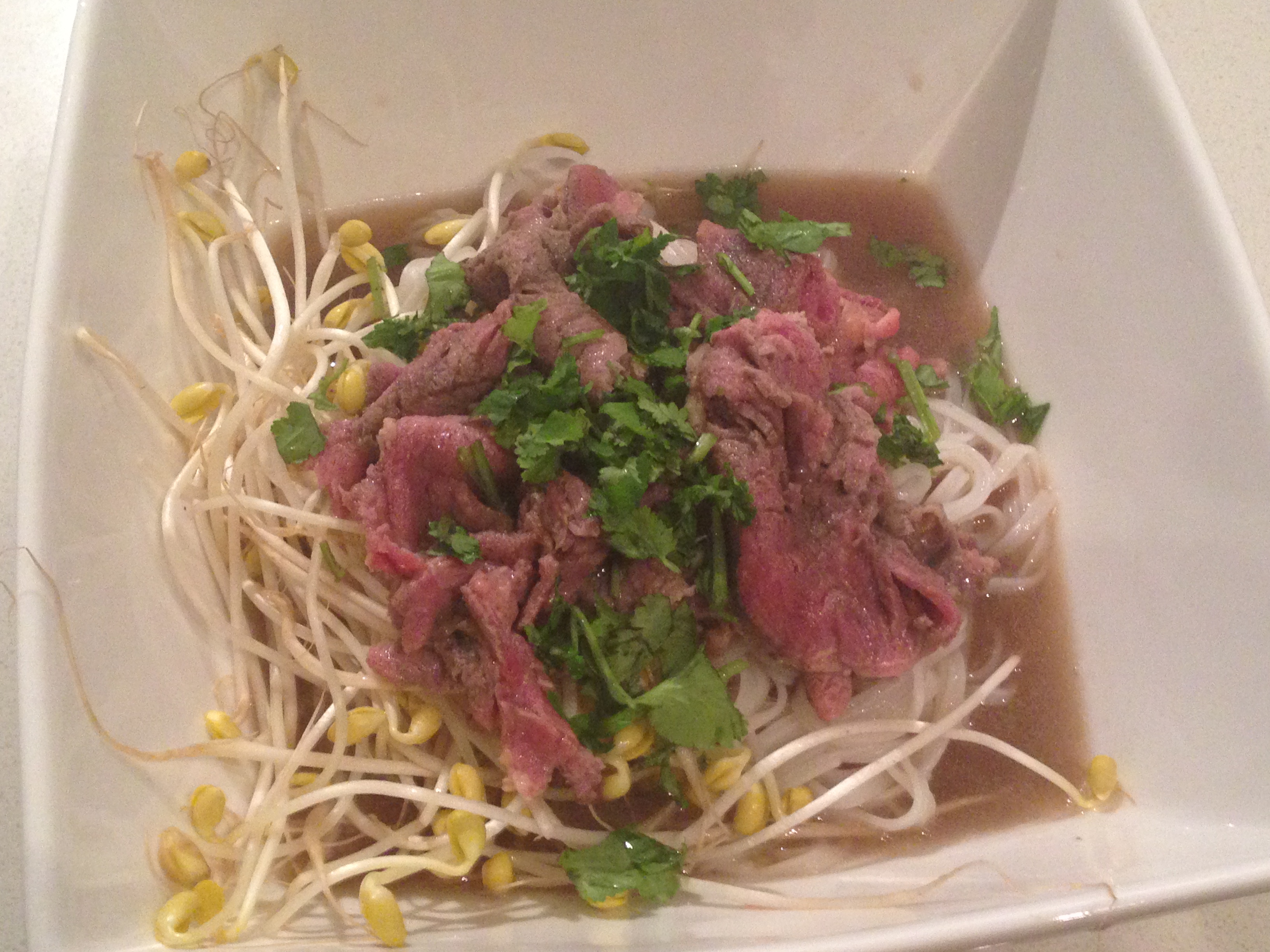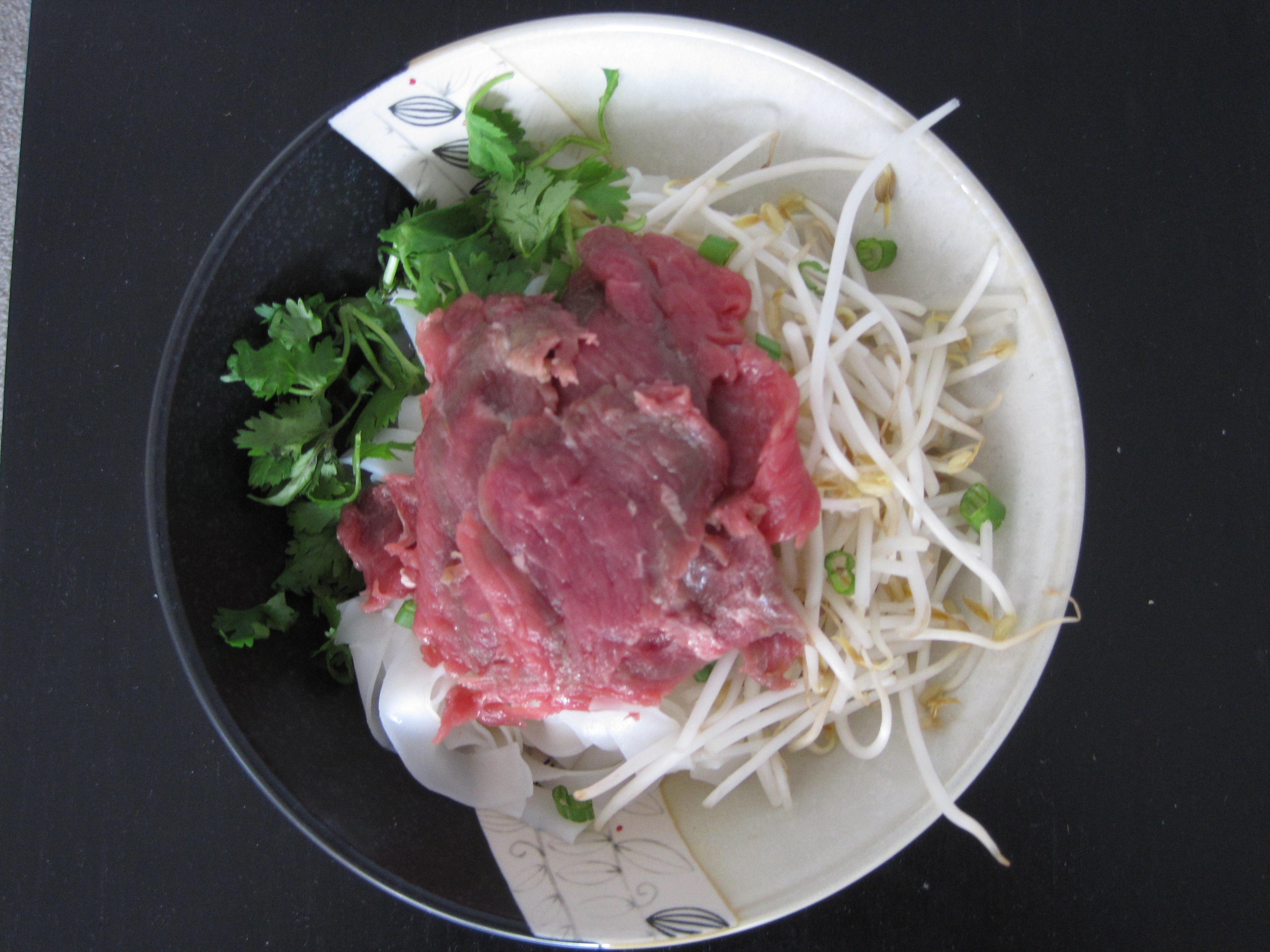 Prepare the rice noodles as per the directions on the package of noodles.  Bring your broth back to a boil.  Fill large bowls with the noodles and arrange the rest of the ingredients in the bowls (see picture above).  As soon as the broth comes back to a boil, ladle it into each bowl.  The hot broth will cook your raw beef slices.  Your guests should also mix the rare beef with the noodles and the hot broth in their bowls.  Serve immediately with a wedge of lime and hot sauce on the side.