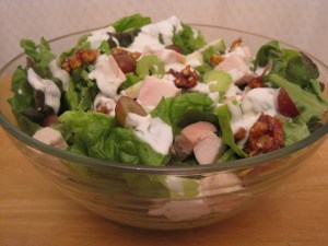 I tried Waldorf Salad for the first time in Boca, Florida, when I was visiting a friend.  The first thing I did when I got back from my trip was make my own waldorf salad (to make up for years of lost time 😉 ).  The original waldorf salad used a dressing of mayonnaise and lemon or vinegar (which I use for my broccoli salad).  The restaurant I had it in served it with an option of a creamy blue cheese dressing or a honey dijon dressing.  I prefer to use blue cheese dressing (recipe here).