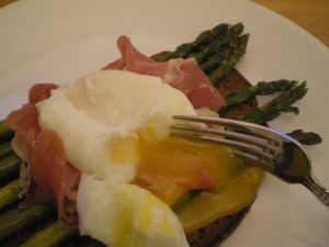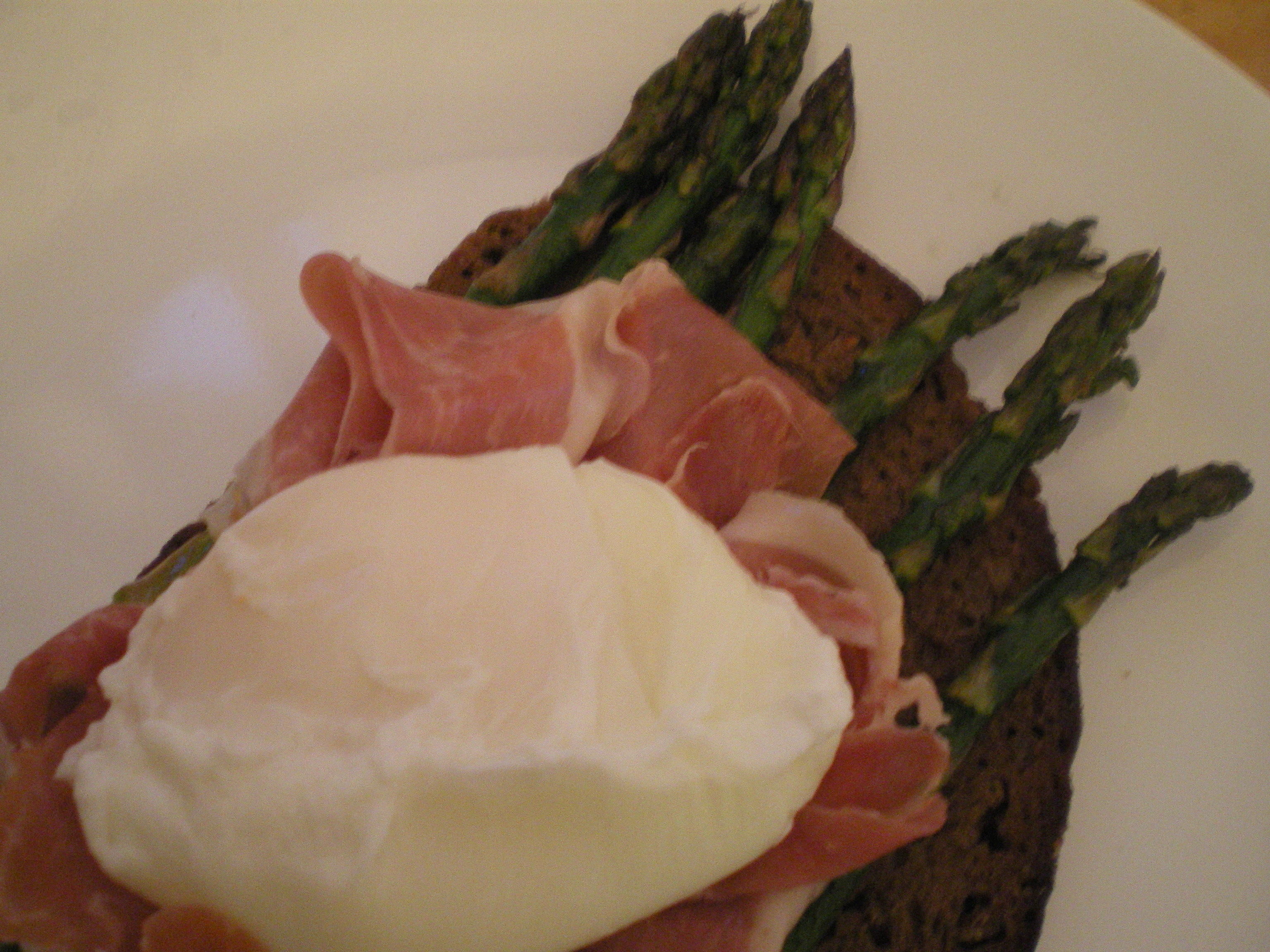 Preheat the oven to 450 F. Meanwhile, prepare a saucepan of poaching water (see How to Poach an Egg here). Meanwhile, toss the asparagus with olive oil, a pinch of salt and pepper and place on a baking sheet in a single layer. Roast the asparagus in the oven for 10 to 15 minutes, depending on the thickness of the asparagus. Plate the asparagus onto 4 plates. Note: I roasted my asparagus in the oven but you could grill asparagus using a grill or grill pan. Meanwhile, toast your bread of choice and poach the eggs as per the instructions here. When the eggs are ready, remove them from the pan with a slotted spoon and gently blot on a tea towel to remove the excess water. Plate immediately with the asparagus along with 1 to 2 slices of prosciutto per plate. Pour on the hollandaise sauce and serve immediately.