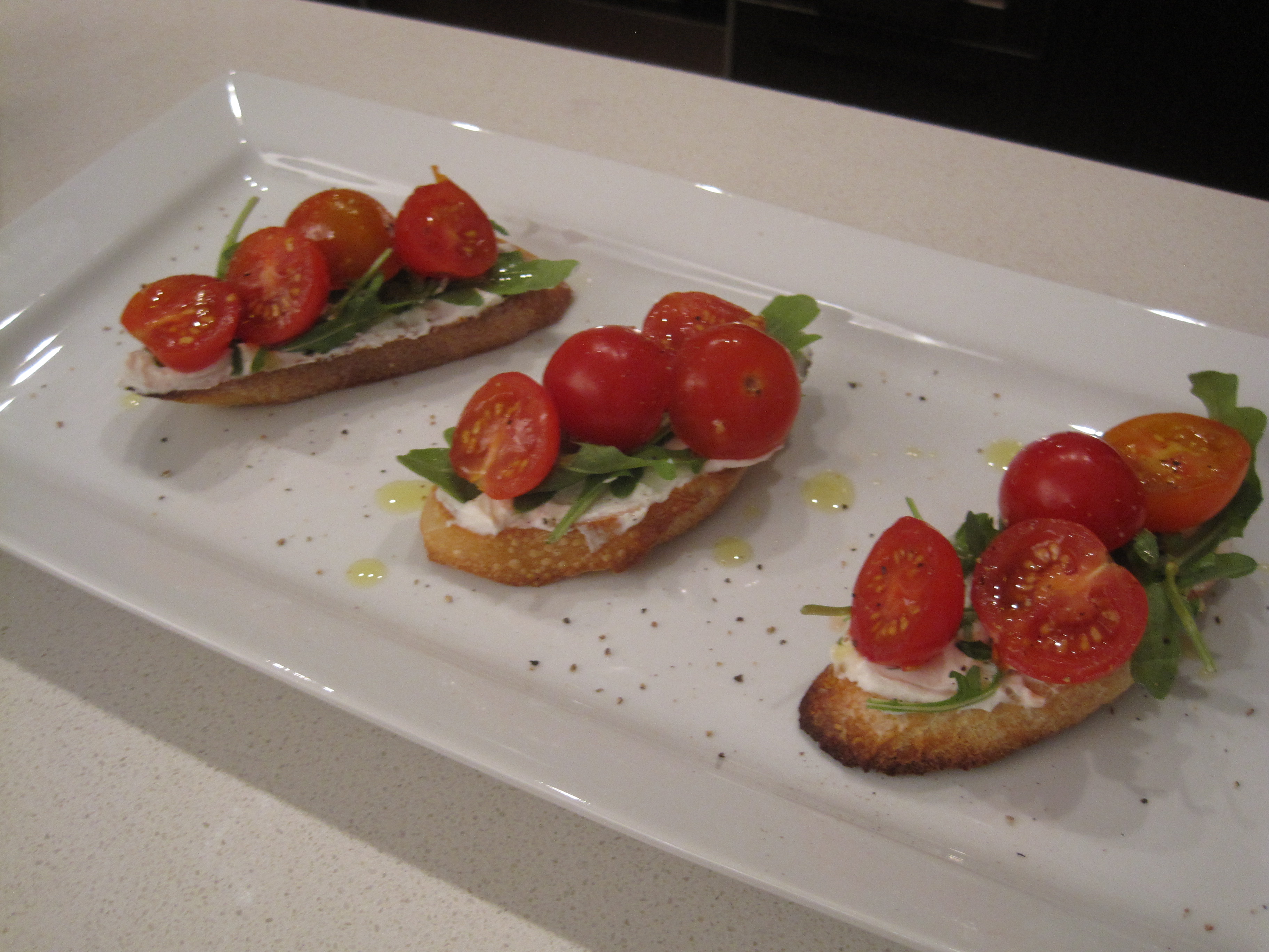 After John’s housewarming party, I made ricotta and tomato crostini to use up a variety of our leftovers. Ricotta and tomato crostini are beautiful and easy to make for any party. Top toasted baguette slices (baked in a preheated 350 degrees F oven for about 7 minutes) with a thin layer of ricotta cheese, baby arugula or rocket, and halved cherry tomatoes (try combining red and yellow cherry tomatoes). Top with coarse sea salt, freshly cracked black pepper, a light drizzle of high quality extra virgin olive oil, and some fresh basil for garnish (if desired).
