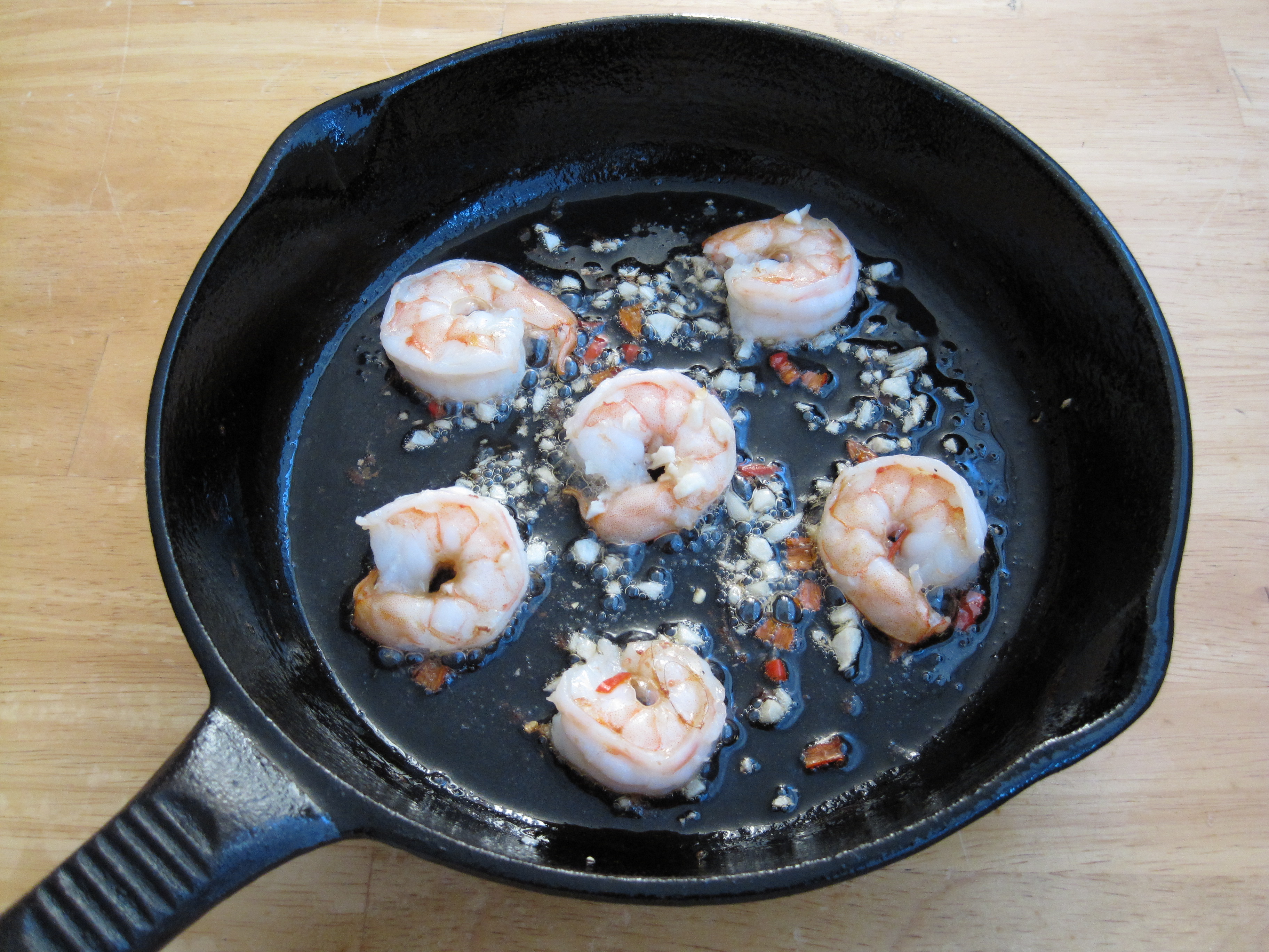 Heat a small cast iron pan over medium heat.  Once the pan is hot, add enough olive oil to coat the bottom of the pan.  Once the oil is hot, add the shrimp.  When one side of the shrimp is pink and it is almost cooked half way, about 30 seconds, turn the shrimp over.  When the other side is pink, about 30 seconds, turn the heat off.  Do not overcook the shrimp.  Add the garlic, the red chili, and a pinch of coarse salt.  Give the pan a few shakes and remove from heat.  Do not allow the garlic to brown.  Serve immediately.