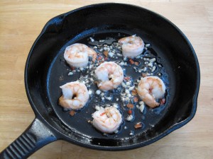 Gambas al ajillo, or shrimp with garlic, is a Spanish tapas (ie. appetizer).  I first tried it in a popular local restaurant years ago.  It’s garlicky and spicy, and so simple to make at home.  The first time Ed tried it, he liked it so much that I made it for him two days in a row.  I’ve re-created the dish that’s served at Chez Piggy, Kingston, ON, but I doubt it’s very authentic.  At the restaurant, they serve this sizzling on a hot plate but I use my small cast iron pan instead.