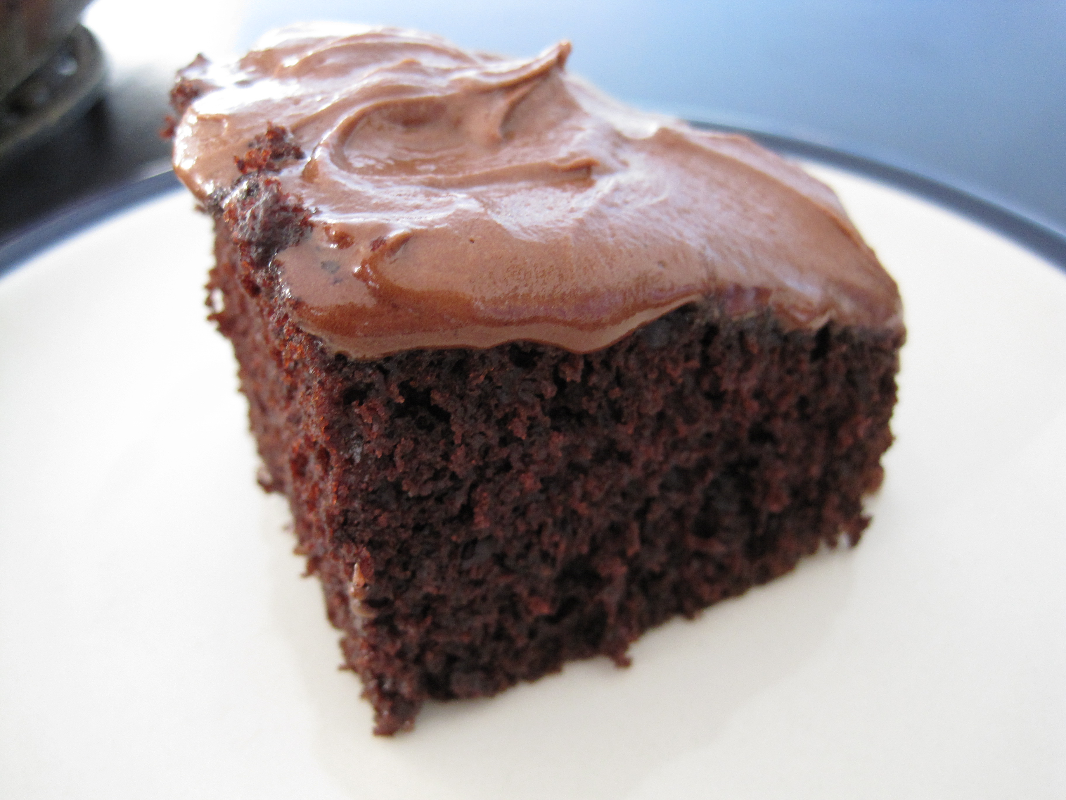 3.  This is the perfect casual chocolate cake.  It’s a great weeknight dessert.  This recipe isn’t about making a pretty-looking cake (although you could if you wanted to).  So if you’re just making this for your family (or if you’re like me and you’re just making it for yourself), it’s perfect because it only makes an 8 in x 8 in square cake in a single layer.  It requires minimal effort because you don’t have to remove the cake from the pan before serving, you don’t have to make a layer cake, and you frost only the top of the cake, still in the pan.  [Fewer dishes to wash.]
