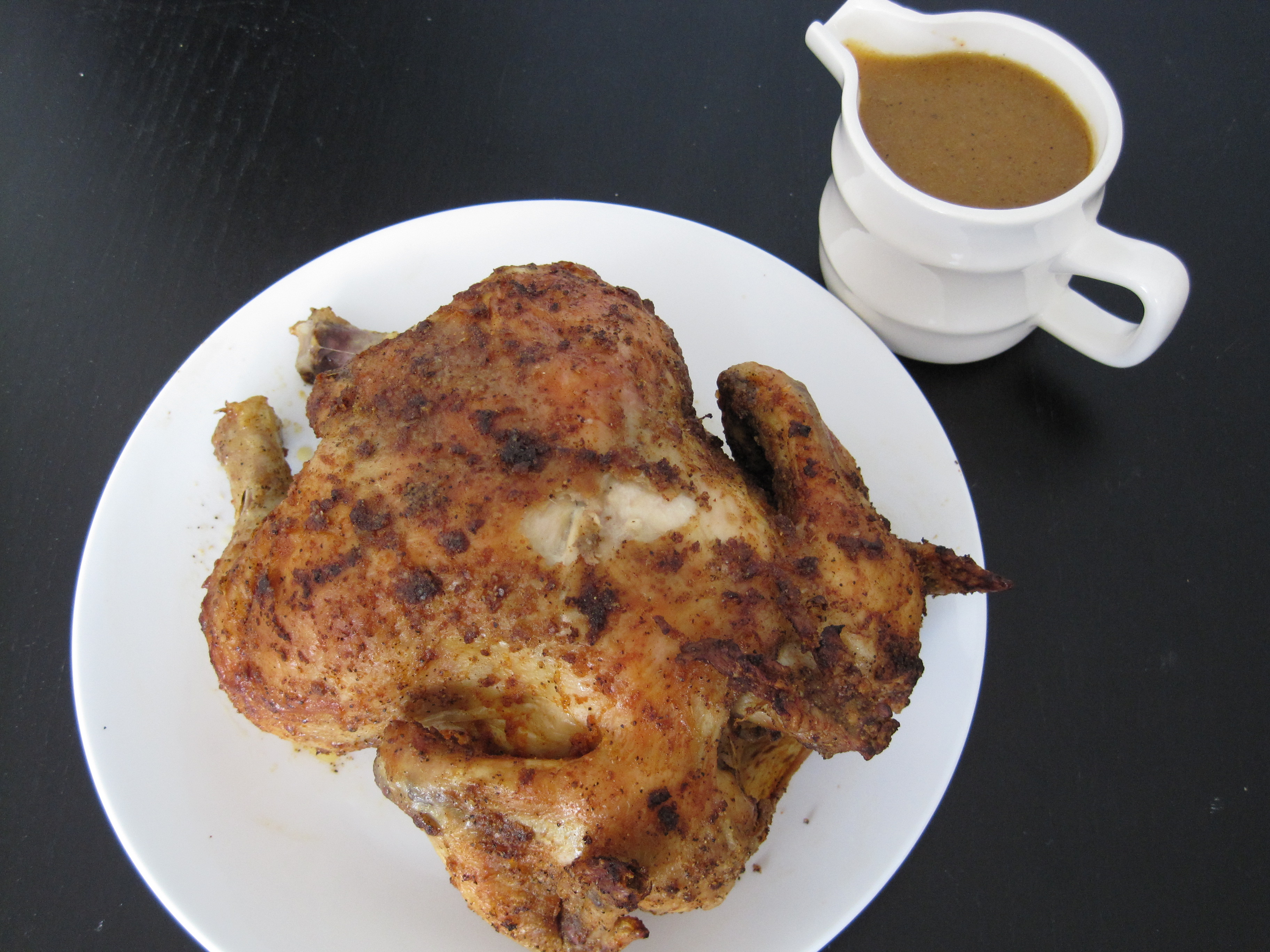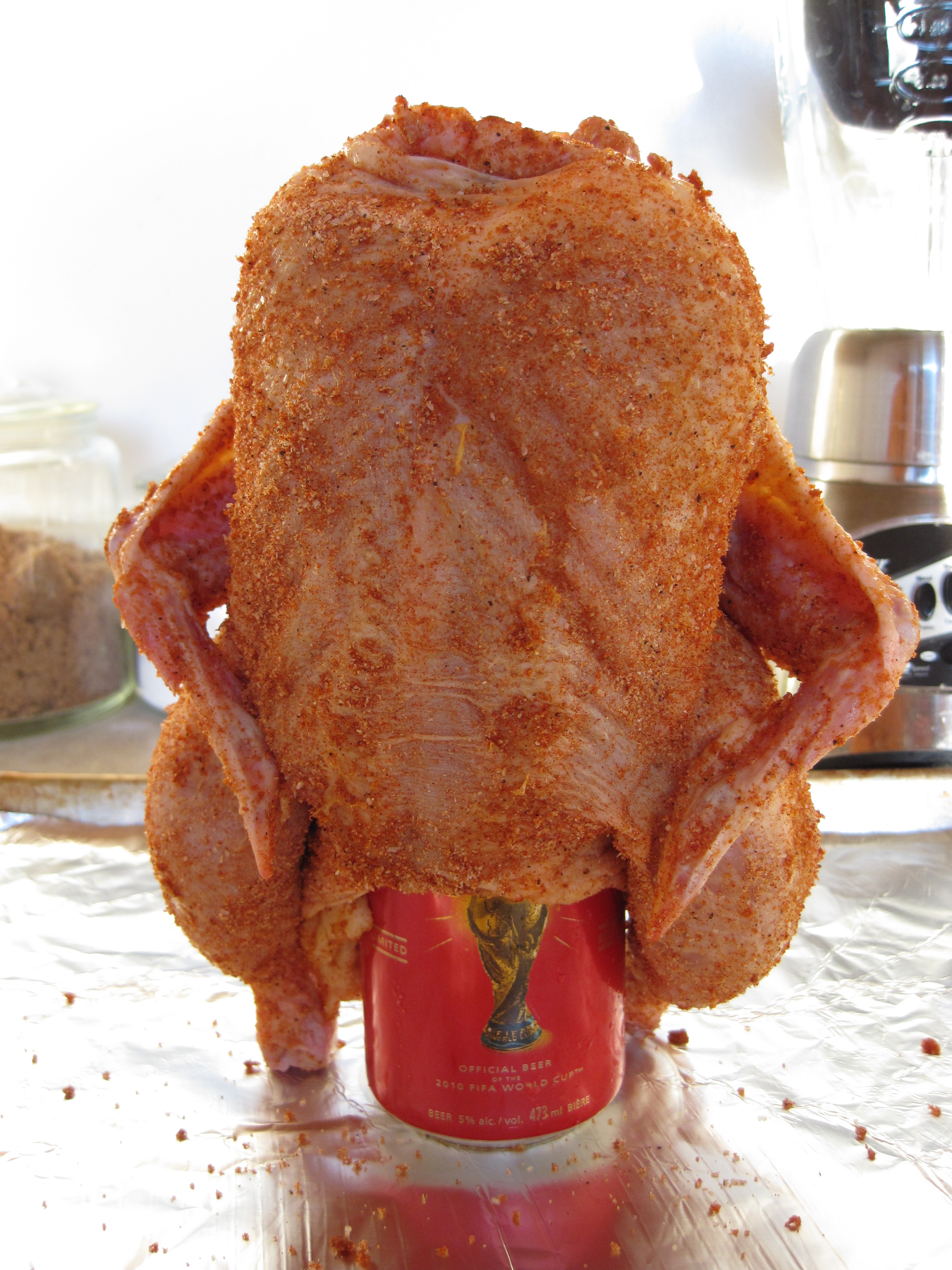Remove all of the racks from your oven except for one on the lowest level. Preheat the oven to 375 F. Rinse the chicken under cold water and pat dry with paper towels. Open the can of beer, pour out 1/3 of the liquid (for drinking) and set the can aside. In a small bowl, mix together the paprika, garlic powder, onion powder, salt and papper. Rub the seasoning all over the chicken, including the cavity. Put the remaining seasoning into the can of beer. Note that the beer may foam over. Line a baking sheet with aluminum foil, place the beer can in the middle of the sheet, and place the chicken over the beer can so that the chicken is standing up with the wings up and the drumsticks pointing down (ie. with the beer can up the chicken’s butt). Place in the oven and cook for 45 to 55 minutes (turning once half way), until the meat starts to shrivel away from the ends of the bones and the juices from the thigh run clear when pierced with a sharp knife. Do not overcook the chicken. When the chicken is just cooked through, carefully remove it from the oven and remove the chicken from the beer can (I used thongs and oven mitts). Set the chicken on a plate to rest for about 10 minutes before cutting it into pieces and serving.