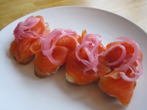 Notes: I highly recommend that you make the pickled red onions. They add the most pleasant sweetness (surprise!) and texture to this crostini. Smoked salmon is more commonly served with capers. Capers would also enhance the visual appeal of crostini. However, I usually leave them off because they add too much sodium to the already salty salmon for my taste (and health).