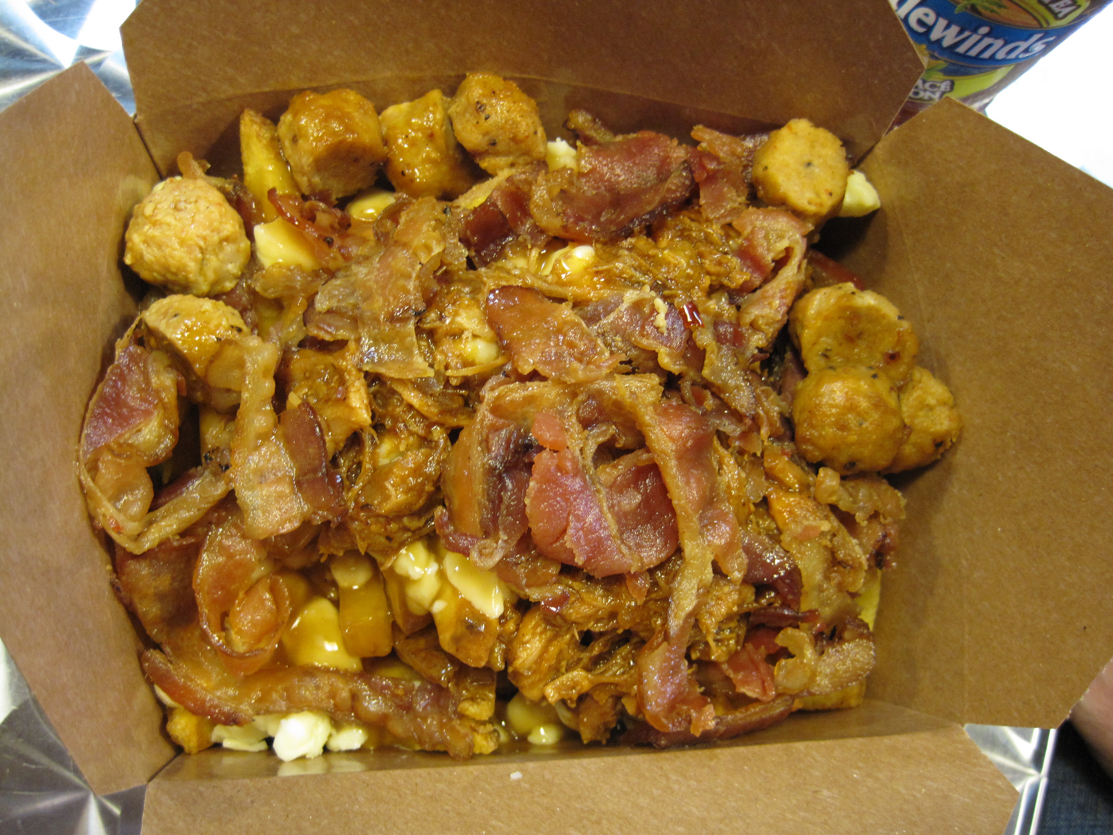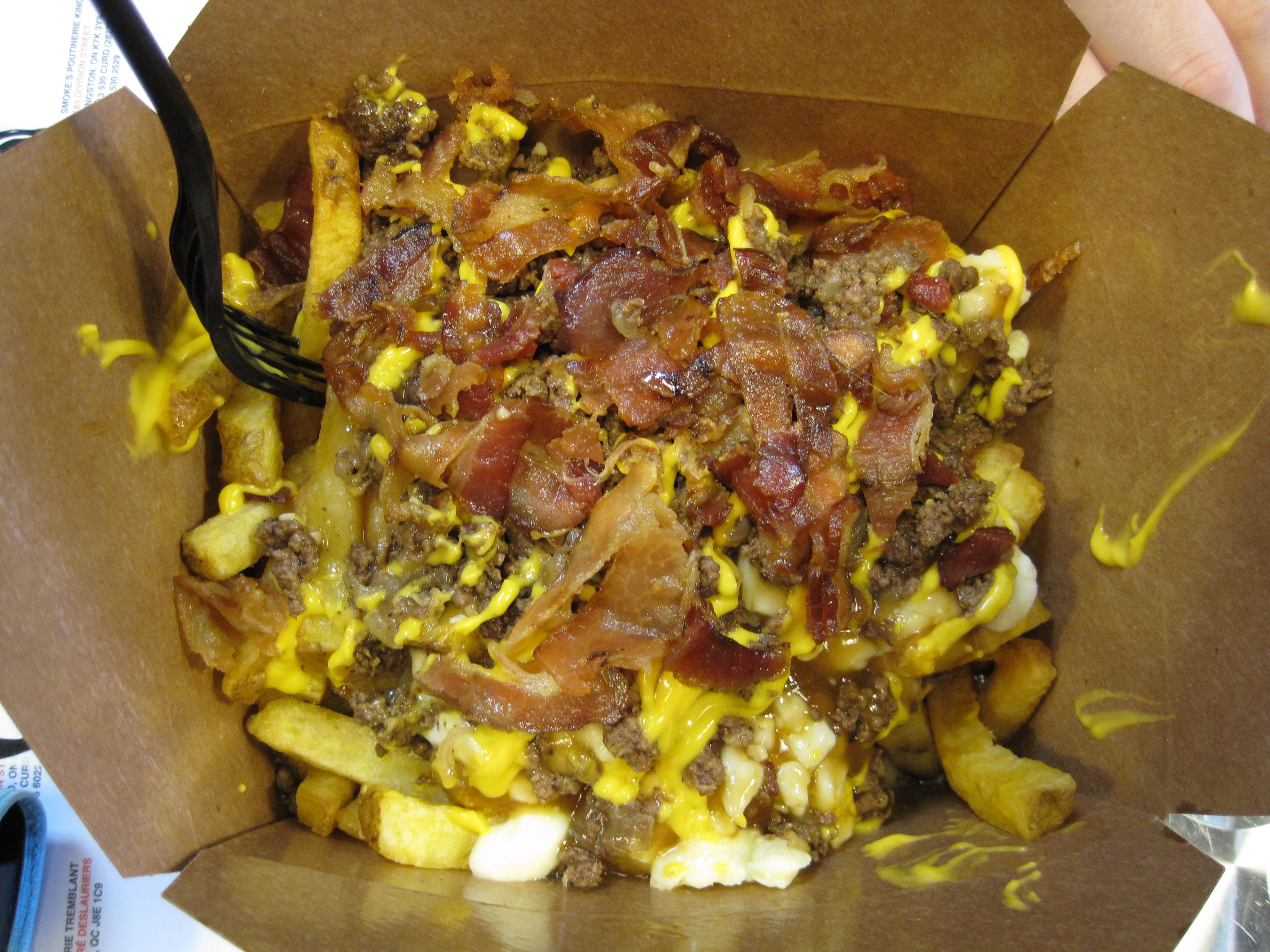 Photo below:  Large size triple pork poutine (pulled pork, double smoked bacon, and sausage)