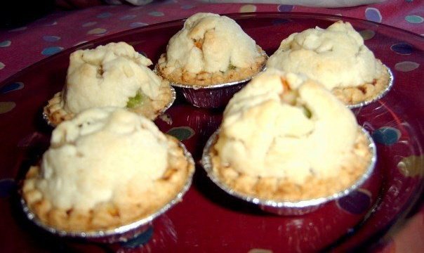I have been making pot pies for years and it is still one of the dishes that Ed requests the most. I’ve made family style pot pie, individual pot pies and even miniature pot pies (second photo below) for pot lucks and parties. This is a very forgiving recipe. You could use half and half instead of cream, and you can use whatever vegetables you have on hand. This is a great way to use up left over turkey because you can freeze the pot pies and then bake them from frozen.