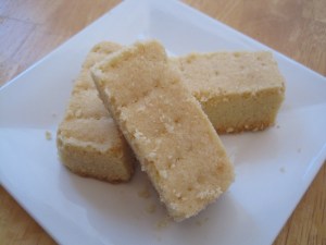 Lightly grease and flour a 9″ x 9″ square pan.  Preheat the oven to 300 F.  Using a stand mixer or hand-held electric mixer, cream together the butter and sugar until fluffy and pale in colour.  Gently mix in the flour and semolina or cornflour until just combined.  The consistency of the dough should be soft, not sticky, and not firm enough to roll.  Press the dough firmly into the baking pan.  It is important that you pack the dough well or else the cookies will break apart too easily.  Prick the dough all over with a fork.  Bake until the top becomes lightly golden.  This will take about 50 minutes (longer if you’re using a glass baking dish).  Place on a wire rack (pan and all) to cool.  When you remove the pan from the oven, the cookie may still give when touched.  It will firm up as it cools.  You can cut the shortbread into rectangles before it finishes cooling, but wait until they have cooled completely before serving.