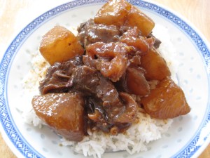 After 1 hour of simmering, add the daikon radish and simmer for another hour, covered or partially covered depending on how much liquid you have left in the pot.  At the end of 2 hours, you want 1/2 of the original liquid remaining if you’re only braising beef and radish.  You want 3/4 of the original liquid remaining if you’re braising beef, tendons, and radish.  It is better to have too much liquid than too little.  The beef and tendons should be tender and chewy.  The daikon radish should be soft and easily pierced by a sharp knife, but not mushy.  Strain out the beef, tendons, and radish and set aside.  Discard the ginger, star anise, and cinnamon stick.  If you only have a small amount of liquid left in the pot, whisk together 1 tbsp of cornstarch in 1/4 cup of water and add this to the pot.  If you have a lot of liquid left, ladle out 1/2 cup of the liquid into a small bowl and whisk in 2 tbsp cornstarch.  Then add this back to the pot.  Bring the sauce to a boil, stirring constantly, and simmer until you’ve achieved your desired consistency.  Then add the beef, tendons, and radish back to the pot, mix well with the sauce, and remove from heat.  Serve hot over rice or noodles in soup with hot sauce on the side.  Add a little bit of water when reheating leftovers.  This freezes well.