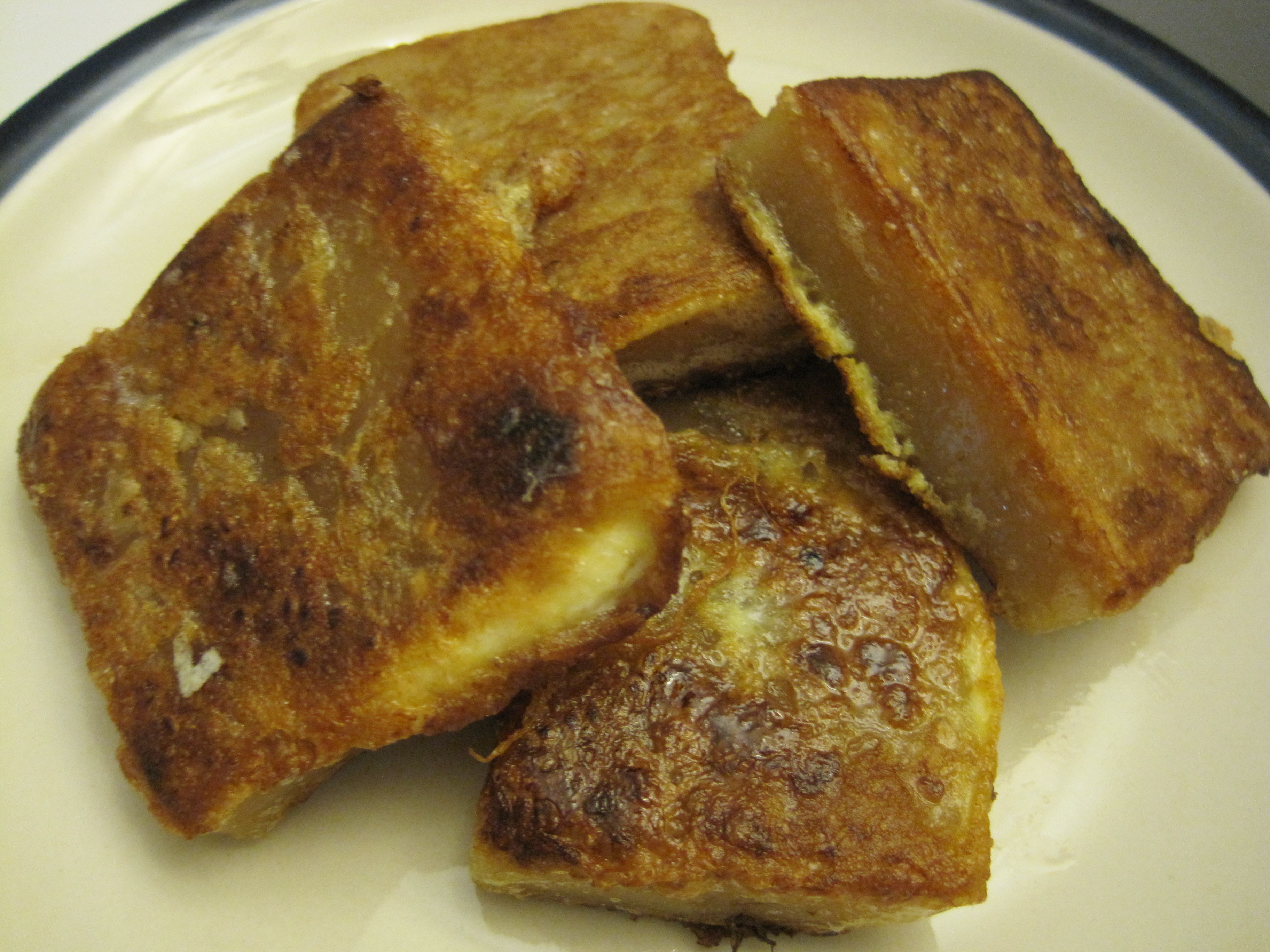When ready to eat, remove the cake from the pan and invert it onto a cutting board.  Cut it into quarters.  Then cut each quarter crosswise into two 2 inch wide strips (not into wedges).  Each of these strips should then be sliced crosswise into 1/4 inch thick slices.  Heat a skillet over medium high heat.  Lightly coat the pan with vegetable oil.  When the oil is hot, dip and coat the slices of cake with the beaten egg and place them into the hot pan.  Do not overcrowd the pan.  Pan fry each side until golden brown and crispy, about 2 minutes each side and flipping once.  Then transfer to a clean plate (do not stack the pieces) and serve immediately while still hot.  The insides will be warm, soft and gooey and the outsides will be slightly crispy.