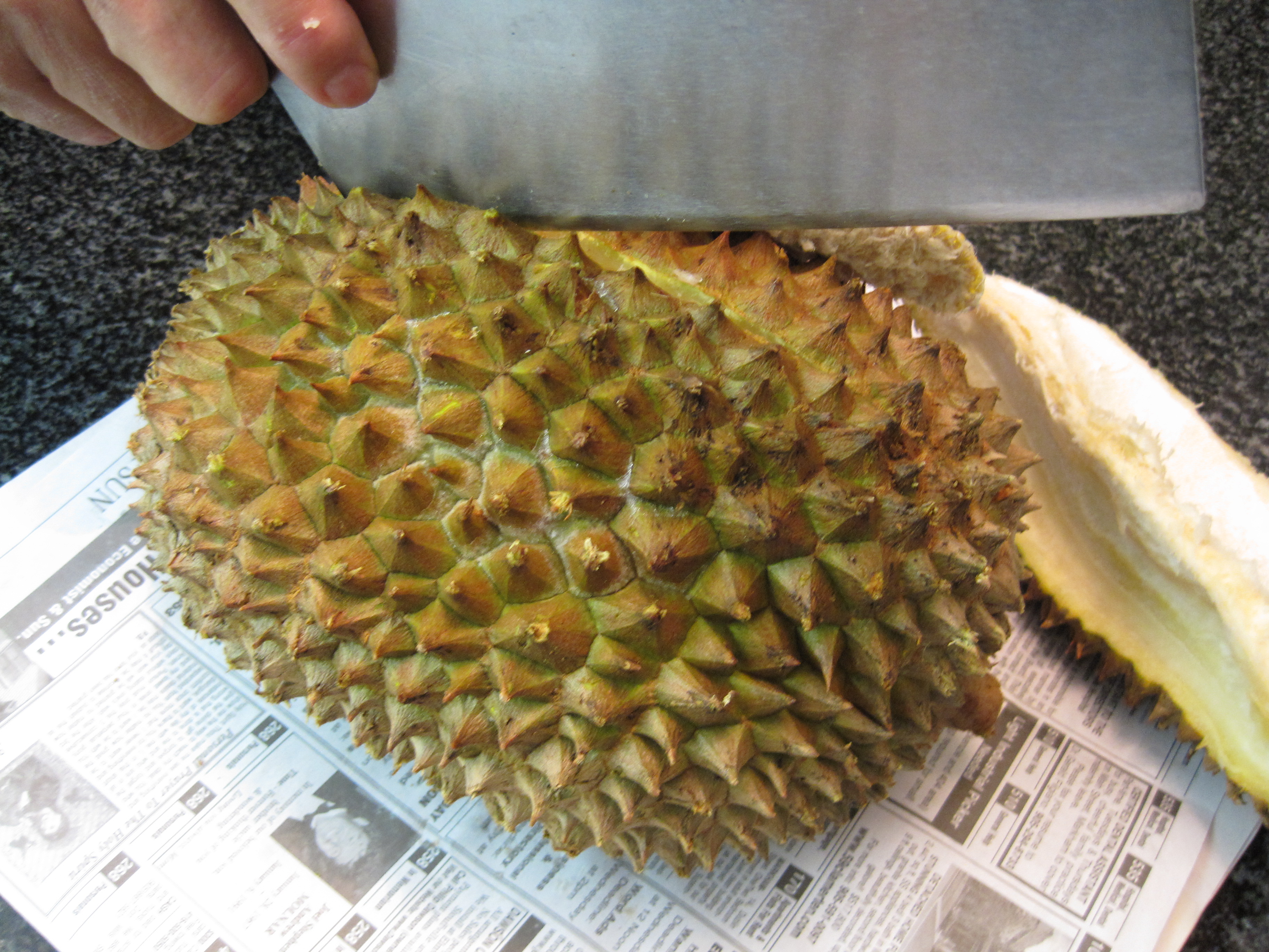 1. You will need a large, sharp, and heavy knife. We prefer to use a cleaver. With a thick towel between one of your hands and the fruit, position the durian so that the midline of one of the lobes is facing upwards and running vertically. Then use many short, quick motions to dig (ie. stab) the back heel of your knife along that midline all the way down the fruit (see photo below).