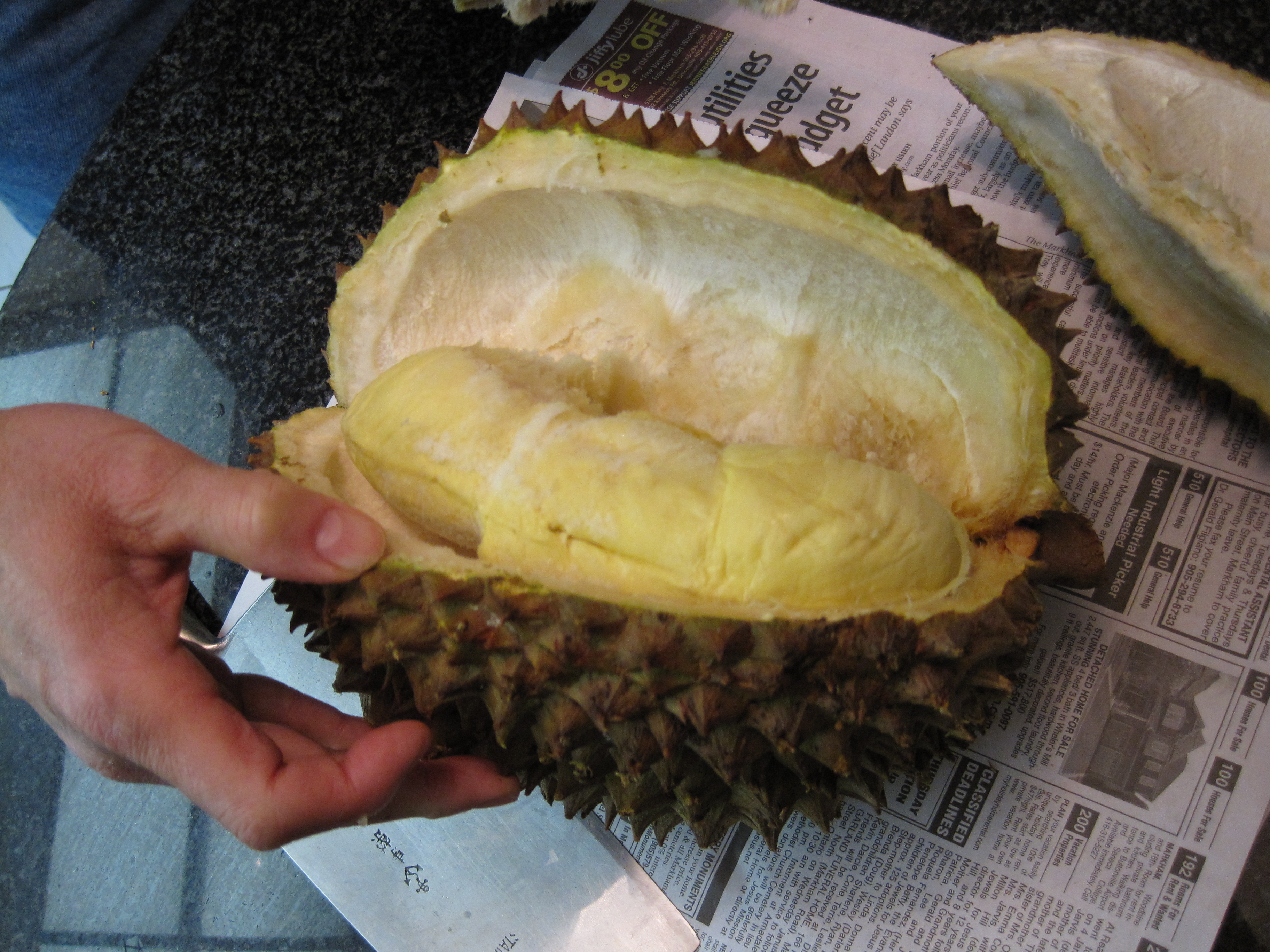 Durian fruit is definitely an acquired taste – one which can only be acquired if you can get over the acquired smell. They are heavy and covered with pointy, dangerous spikes. As you can see from the photos below, the fruit is shaped into several lobes. Each lobe contains soft, yellow flesh that encases one or two large, light brown, hard seeds. You can eat it as is (not the seed), or you can use it in smoothies and cakes, etc. In North America, you are most likely to find these frozen. Simply defrost the durian at room temperature and cut open. Opening a durian almost always involves injury, so be very careful. I get scratched (and bleed) several times simply transporting it from the grocery store to the house. I have provided tips on how to select a durian and photo instructions for how to open one. Notice that it’s my dad doing it. Thanks dad 🙂