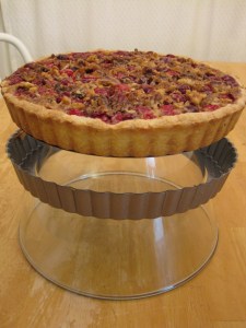 I learned this great tip from Martha Stewart’s Everyday Food magazine.  Unfortunately, it only works on tart pans with a removable bottom.  This single [simple] move will allow you to:  1. easily and safely remove a hot, baked tart from its pan; 2. cool your tart faster; and 3. prevent the crust from being over baked.  Simply turn a flat bottomed, heatproof bowl upside down and set the tart pan on the bottom (now pointing upwards) of that bowl.  See the photo below of my cranberry walnut tart cooling.