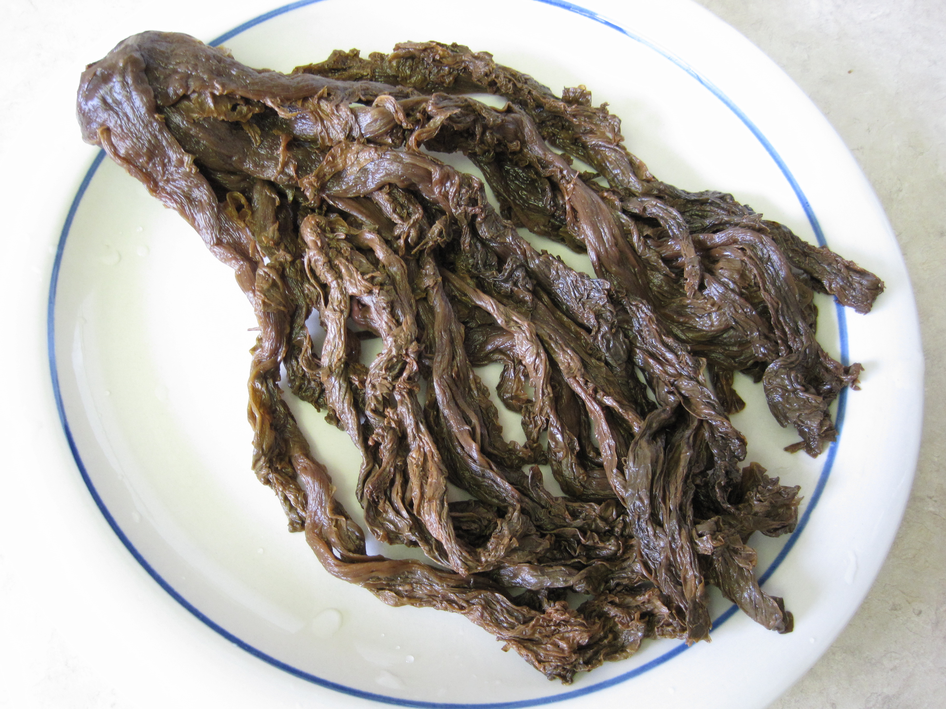 100 g salted/preserved mustard (Note:  There is a salty version of this and a sweetened version of this.  Be sure to choose the sweet version.  Otherwise this dish will be much too salty.)