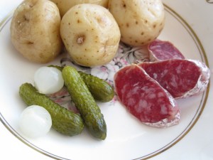 Raclette (the meal) consists of melted Swiss or French raclette (the cheese) served over dried meats, boiled potatoes, pickled onions, and gherkins/cornichons (see my favourite brand here).  Although there are commercially available raclette warmer machines and raclette grills for home entertaining, I much prefer the traditional method of melting the cheese by an open fire.  A half round of raclette cheese is placed (ie. propped) near a fire with the cut side facing the heat.  As the surface of the cheese warms, a large knife is used to scrape the melted cheese onto your plate.  If you don’t have access to a fire, you can use your electric or gas stove.  Simply stick a long, sturdy fork into your block of cheese and hold it close to the hot stove burner.  I imagine you could probably do this with a BBQ grill as well.  Note:  Don’t eat the rind. Luckily, it is easy to peel away as the cheese melts.