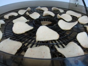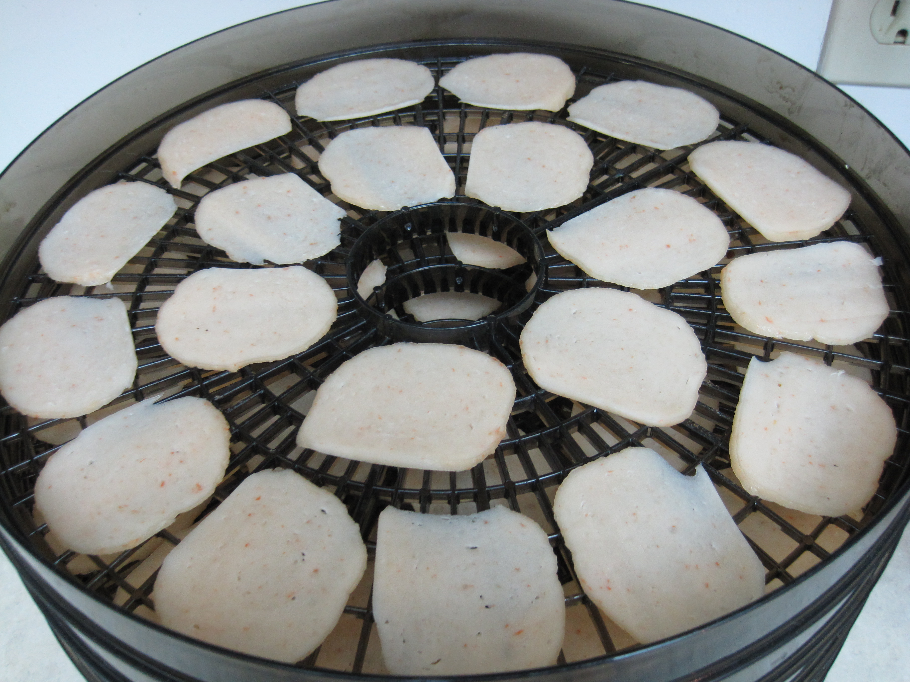 Place the slices of shrimp chips in a food dehydrator in a single layer (see photo below left).  Dehydrate the shrimp chips until completely dried out, about 24 hours.  They will curl slightly (see photo below right).  These dried shrimp chips can be stored in an airtight bag or container at room temperature for a few months.  When you’re ready to enjoy them, preheat the oven to 150 degrees F.  Spread out the shrimp chips over a baking sheet and bake them until they are heated through, approximately 10 minutes.  Then heat up vegetable oil 2 inches deep in a wok or large pot over high heat (I suspect the temperature is between 350F and 375F).  Test the temperature of the oil by placing one shrimp chip into it.  If the oil is hot enough, little bubbles will immediately form around the shrimp chip.  Within seconds, it should puff up, enlarge, and float to the top.  They expand quite a bit.  When the colour of the shrimp chip is consistent throughout, it is done.  Immediately remove it from the oil (I use a Chinese brass wire mesh strainer) and transfer it to a brown paper bag lined plate.  Do not allow the shrimp chips to brown at all, as they will taste burnt.  The cooking process happens within seconds, so watch them carefully and don’t deep fry too many at a time.  Shrimp chips are best when eaten the day they’ve been deep fried.