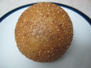 When you have used all of your dough and filling, heat a wok or large pot of vegetable oil that is 3 inches deep over high heat.  The deep frying step of this recipe is the most important and the most difficult part.  Unlike making other deep fried foods, the oil can’t be very hot (i.e. less than 350 F) and the jien duy must be deep fried slowly.  If the oil is too hot, you will end up with dense, greasy, and soggy jien duy.  Unfortunately my thermometer was in a moving box when I made these, so I can’t tell you what the exact temperature was.  But if you sacrifice just a few tester sesame balls, you’ll be able to figure out the right oil temperature.  When you place your hand above the oil, it should feel a bit warm, but not hot.  Also, when you place a tester ball into the oil, small and gentle bubbles should immediately form around the ball.  Turn the balls constantly in the oil as they cook for even browning.  The frying time should take between 12 and 20 minutes.  (Note: I know that sounds like a long time, but it really is necessary.  I tried making these using a higher heat and a shorter cooking time (less than 10 minutes) and the resulting balls were not hollow or crispy, and they were inedible in comparison.)  They will expand, start to float, and brown as they cook.  When they’re done, they will be crispy on the outside, hollow and airy on the inside, and the filling will be heated through. If your sesame balls get too browned too quickly, or if the bubbles surrounding the balls are too vigorous in the beginning, then the oil is too hot.  Sacrifice one tester at a time until you are certain that you have the right temperature.  Then deep fry the rest of them in two or three batches.  Transfer them to a brown paper bag lined plate and allow them to rest for a few minutes before eating them.  Be very careful because they will be very hot and the steam could burn you.  These are best when enjoyed fresh and warm.