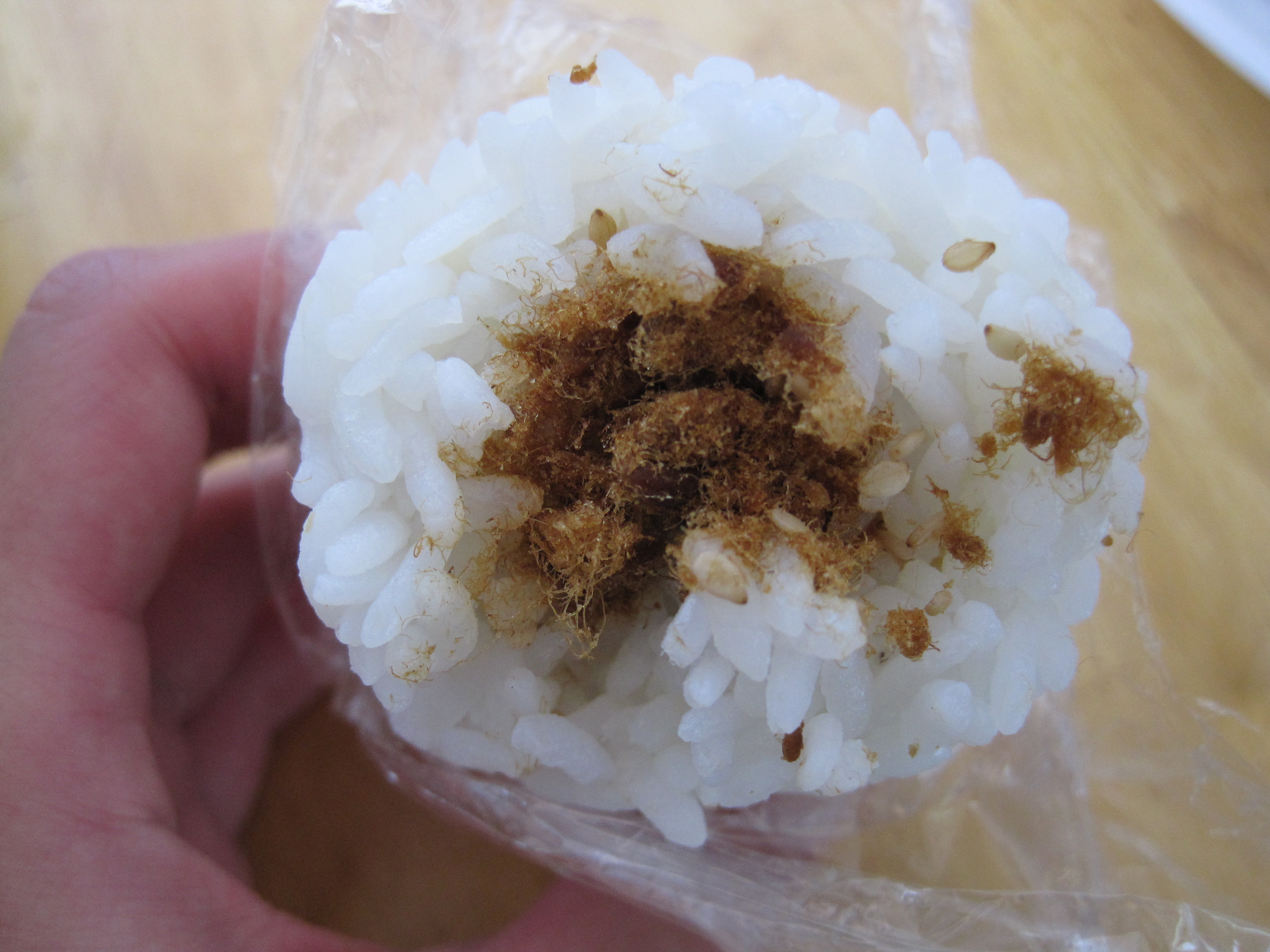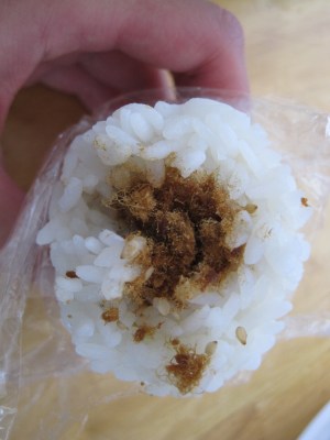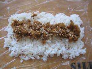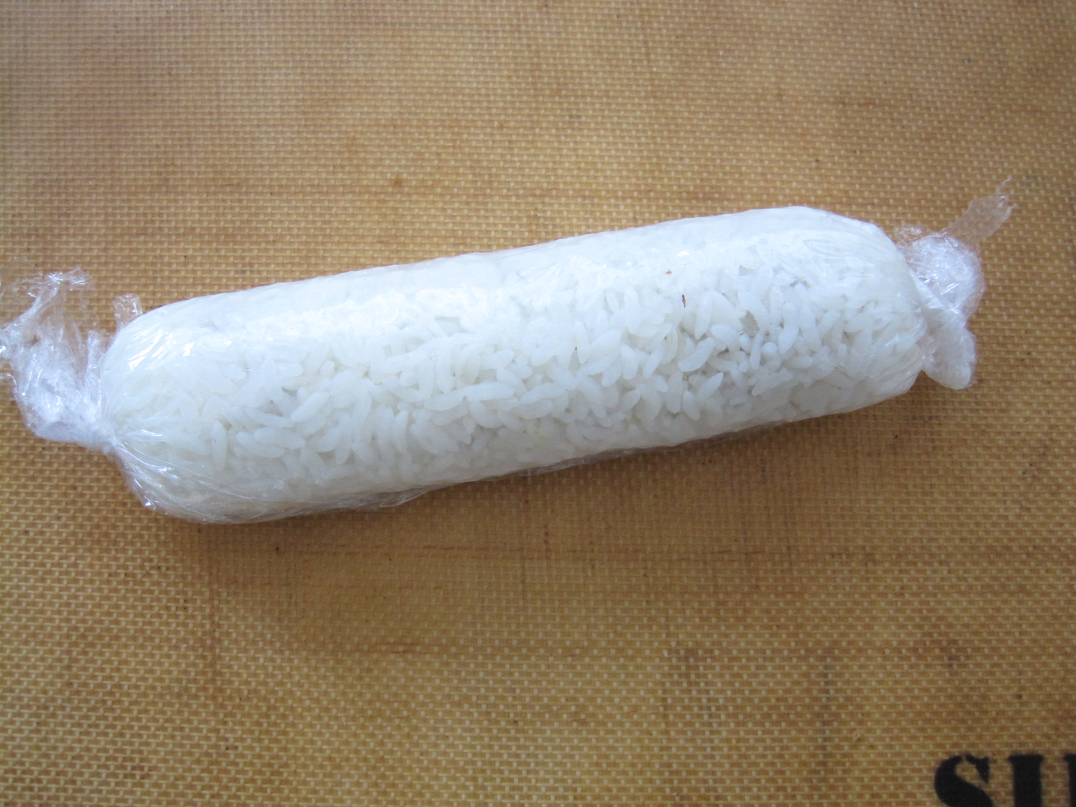 The cooked rice should be warm, but not hot, if the glutinous rice rolls are being served immediately. Otherwise, use cooked rice that is at room temperature. Have a small bowl of water where you’re going to assemble the rolls, because moistening your fingers will help prevent the rice from sticking to your fingers. Lay out a sheet of plastic wrap on top of a sushi rolling mat, tea towel, or silpat (silicone) mat. Use slightly wet fingers to spread the rice onto the plastic wrap in a rectangle, approximately 4″ to 5″ by 6″ to 7″. Spread 2 to 3 tbsp of the pork floss along the middle of the length of the rectangle of rice. Sprinkle a pinch of the toasted sesame seeds over the pork floss. Then lift the bottom end (the length that’s closest to you) of the plastic sheet with the silpat mat (or sushi mat or tea towel) and roll the rice away from your body until it has completely surrounded the fillings. Be sure to roll the rice together tightly and firmly. Don’t allow the plastic sheet to get caught inside the rice roll. When the rice roll has been shaped, wrap the plastic wrap tightly around the rice roll and twist the edges tightly. Serve as is (to be unwrapped from one end and eaten like a burrito) or slice crosswise into pieces like sushi using a large, sharp knife. Store in the refrigerator.
