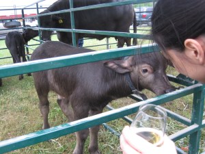 The festival’s program also included seminars, tutored tours, cooking classes, and a gala.  Krystal’s favourite part of the festival was the opportunity to pet water buffalo, an adult female and three 2-week old calves.  We all fell in love with the water buffalo.  They are surprisingly large and social.  One of the calves kept trying to get Krystal to chase him and play with him.  The farmers that we talked to said that the water buffalo follow them around like dogs.  I’d love to make a trip to Stirling, Ontario to see the water buffalo farm.
