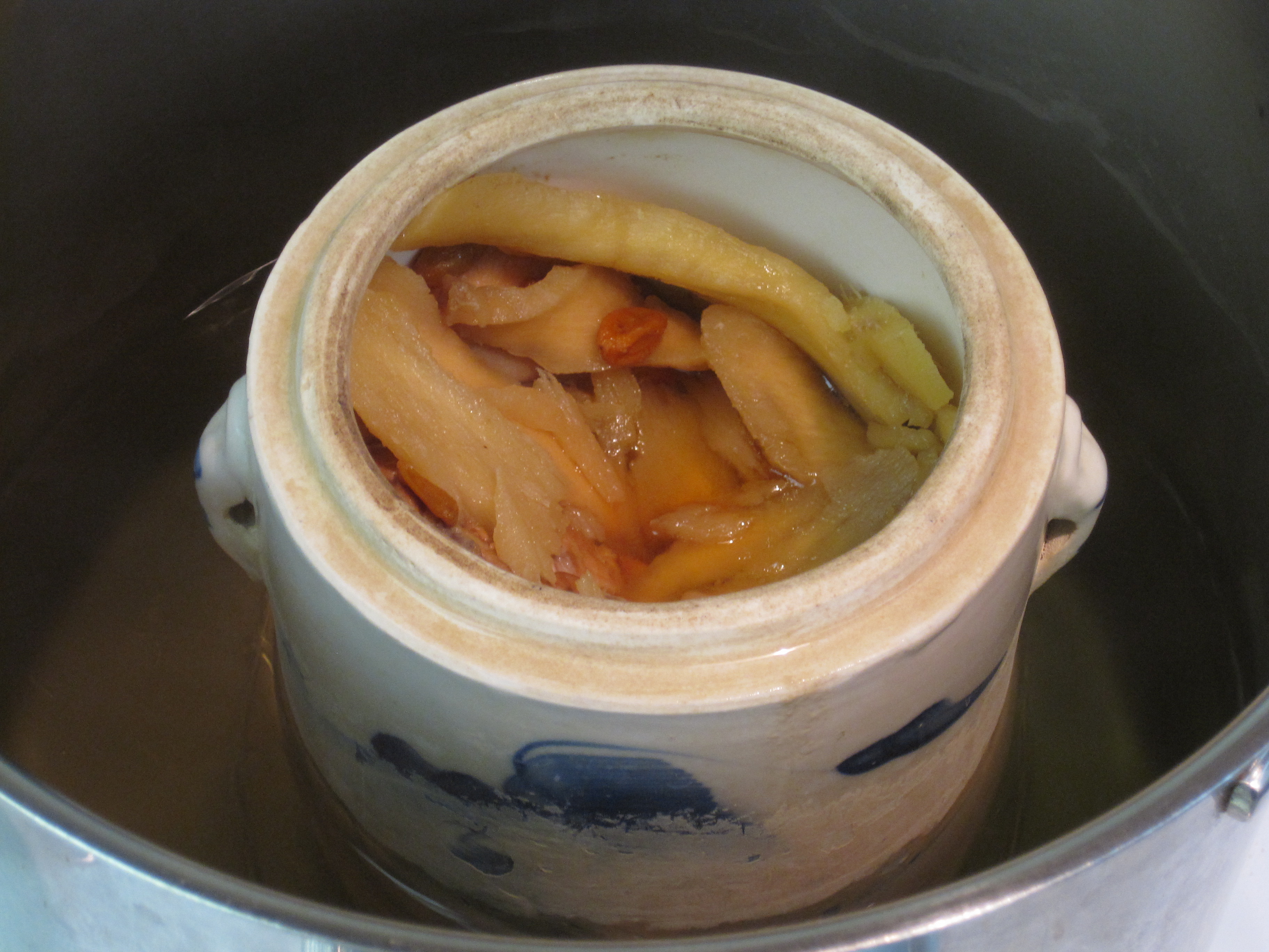 Place the chicken breasts into a Chinese tall, ceramic soup pot.  Add the dried yam, red dates, goji berries, and ginger (if using).  You may need to pack these ingredients tightly into the pot.  Gradually pour the glutinous rice wine into the ceramic pot plus 3 tablespoons of water.  The liquid should come up to 1 inch below the top of the pot.  Cover the pot with its lid.  Set up a large, tall stock pot on the oven burner.  Place a wire rack on the bottom of the stock pot and place the ceramic soup pot on the rack.  Pour water into the stock pot around the ceramic soup pot until the water level comes up to 3/4 of the height of the soup pot.  Cover the stock pot with its lid.  Turn the heat on high and bring the water to a rolling boil.  Then reduce the heat to medium low or medium heat to maintain a strong simmer for 3 hours.  Ladle out the soup from the ceramic pot and serve hot.