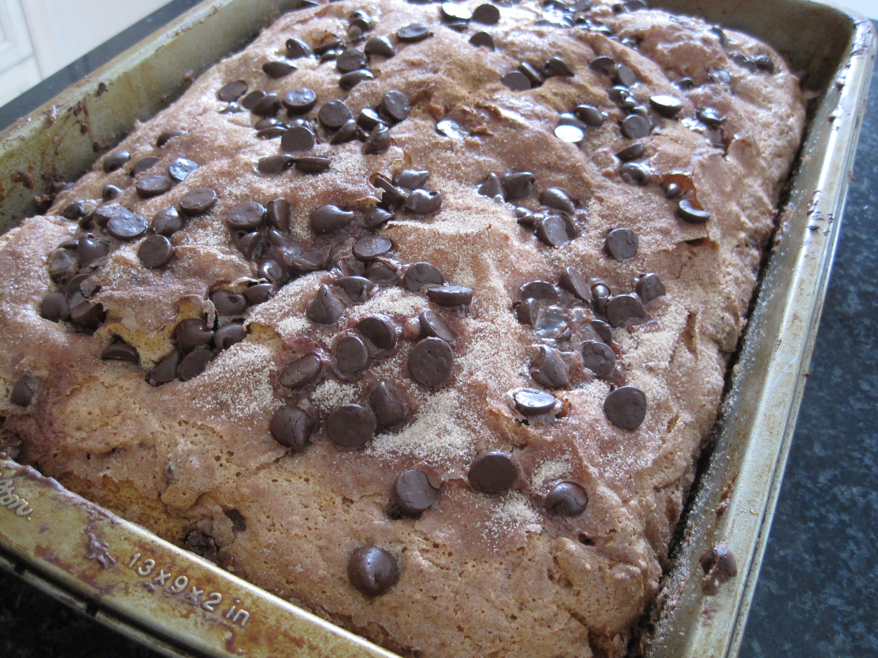 In a small bowl, stir together the sugar and cinnamon for the filling and topping. Spread half of the cake batter in the bottom of the prepared baking pan using a rubber or offset spatula. You may not have a lot of batter, but the cake will rise once baked. Sprinkle half of the cinnamon-sugar evenly over the bottom layer of the batter. Then sprinkle over half of the chocolate chips. Spread the remaining cake batter evenly over the bottom layer of cake using a rubber or offset spatula and smooth the top. Sprinkle the top of the cake with the remaining cinnamon-sugar and chocolate chips. Using the palm of your hand, very gently press the chocolate chips into the batter, just enough for them to adhere to the batter. Bake the cake until a toothpick inserted into the centre comes out with a few moist crumbs attached to it, about 30 to 40 minutes. Rotate the pan halfway through. Transfer the cake to a wire rack to cool completely. You can cut pieces of the cake directly out of the pan. Alternatively, you can place the wire rack directly over the pan, hold the two tightly together and flip the cake upside down and out of the pan using one swift motion. Then place a large plate on top of the bottom of the cake, and holding the wire rack, cake and plate together gently, flip the cake back right side up onto the plate. Cut the cake and serve with a cup of coffee or tea. Store in the refrigerator.