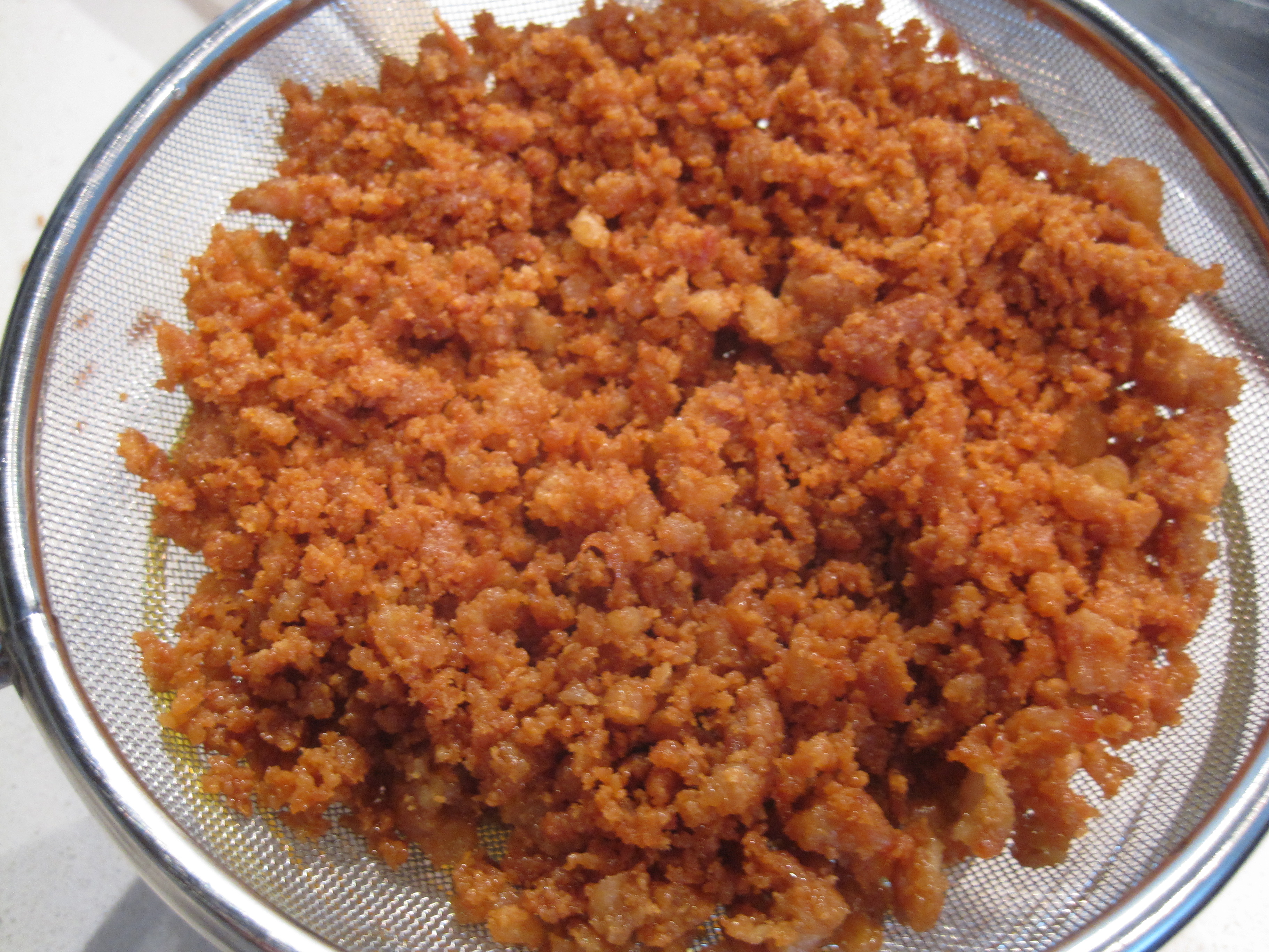 The main types of pig fat can be found in the back (including the shoulder and rump), the belly, and the kidneys (called leaf lard). Although leaf lard is the cleanest, whitest, and best fat for making pastries, I’ve never had any complaints when using back or belly fat to make pie or tart crusts. Although it is very easy to render lard, it doesn’t make sense to render less than 1 or 2 pounds of lard at a time, because the process will fill your home with a distinct odour that is, to many people, unpleasant. But luckily, rendered lard will keep well for at least a month in the refrigerator and even longer in the freezer. If you’re not butchering a large, fatty piece of pork or if you don’t have easy access to a farmer/butcher that sells pig fat, then you could collect scraps of pig fat from every day cooking in the freezer until you have enough for one batch. Another great thing about rending your own lard is the pork cracklings that are left over (photo below).