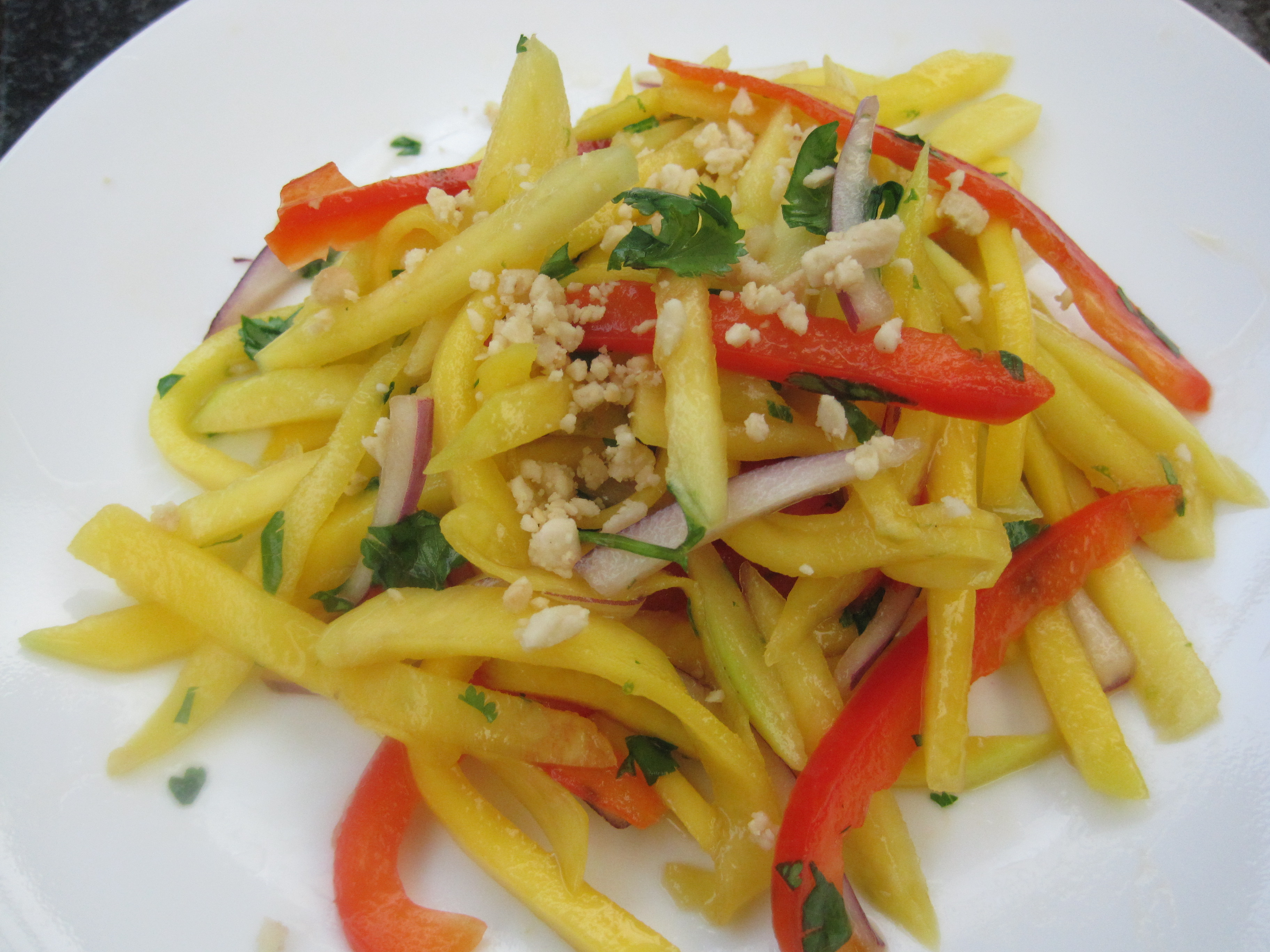 Peel the mangoes and cut the fruit into long and thin strips.  Place them into a large bowl.  Add the thinly sliced red bell pepper and red onion.  Add the prepared sauce to taste (you may have some sauce leftover) and toss everything together very gently.  Once the desired intensity of flavour has been achieved, gently toss in the fresh cilantro and set aside in the refrigerator until ready to serve.  This salad can be enjoyed cold or at room temperature and tastes best 1 day after it was assembled.  Just prior to serving, dish out and garnish with the chopped peanuts (optional).