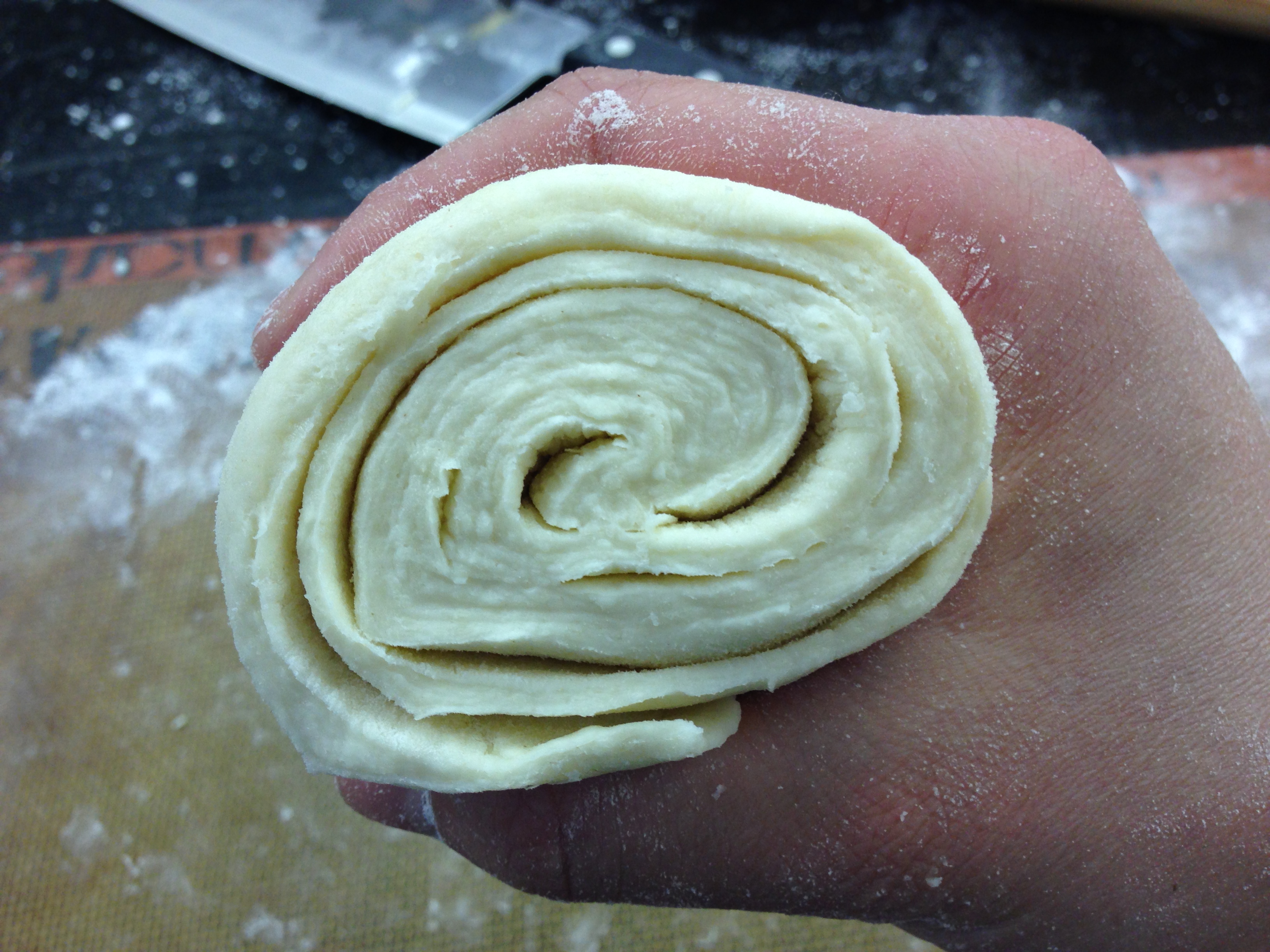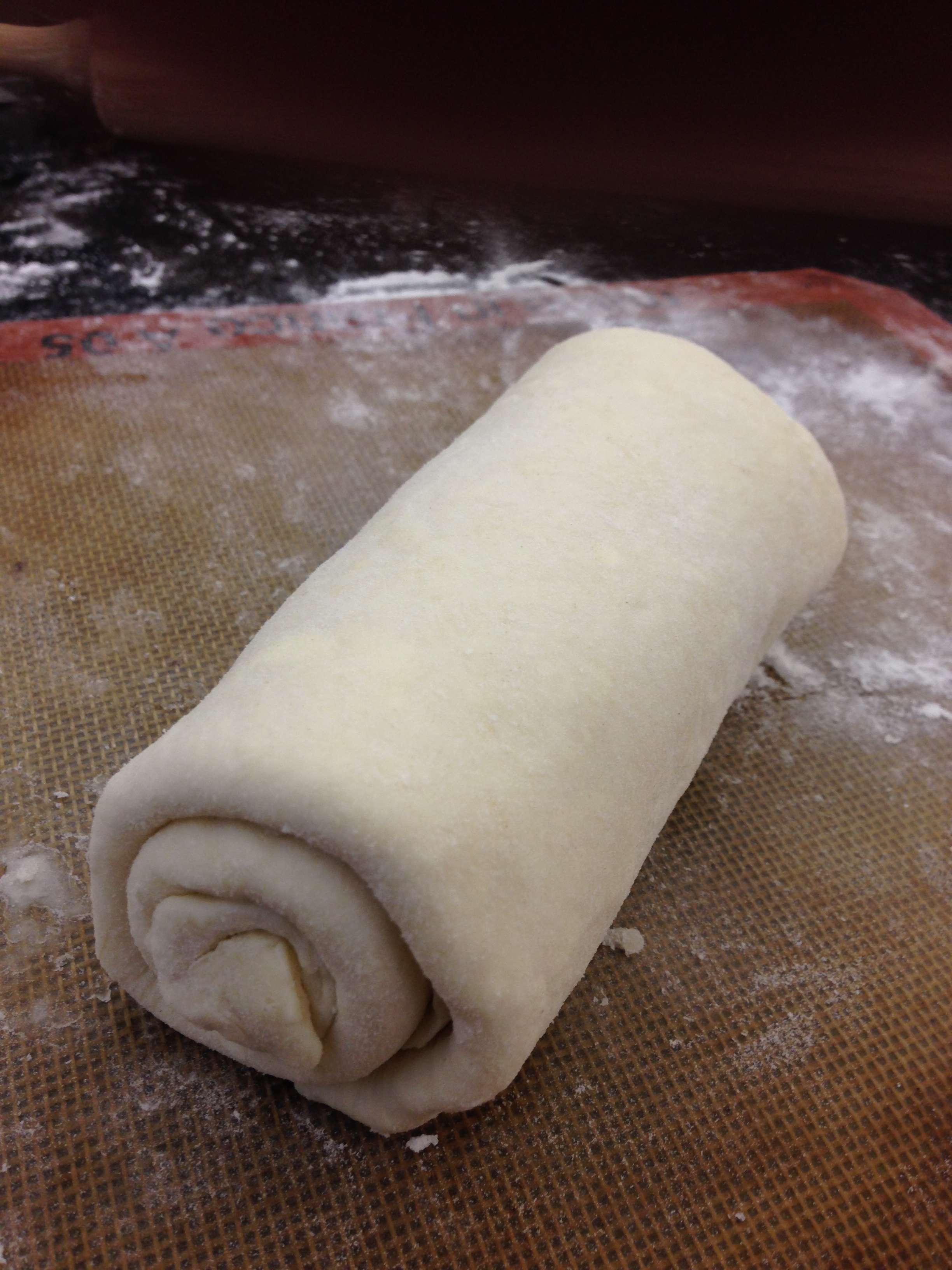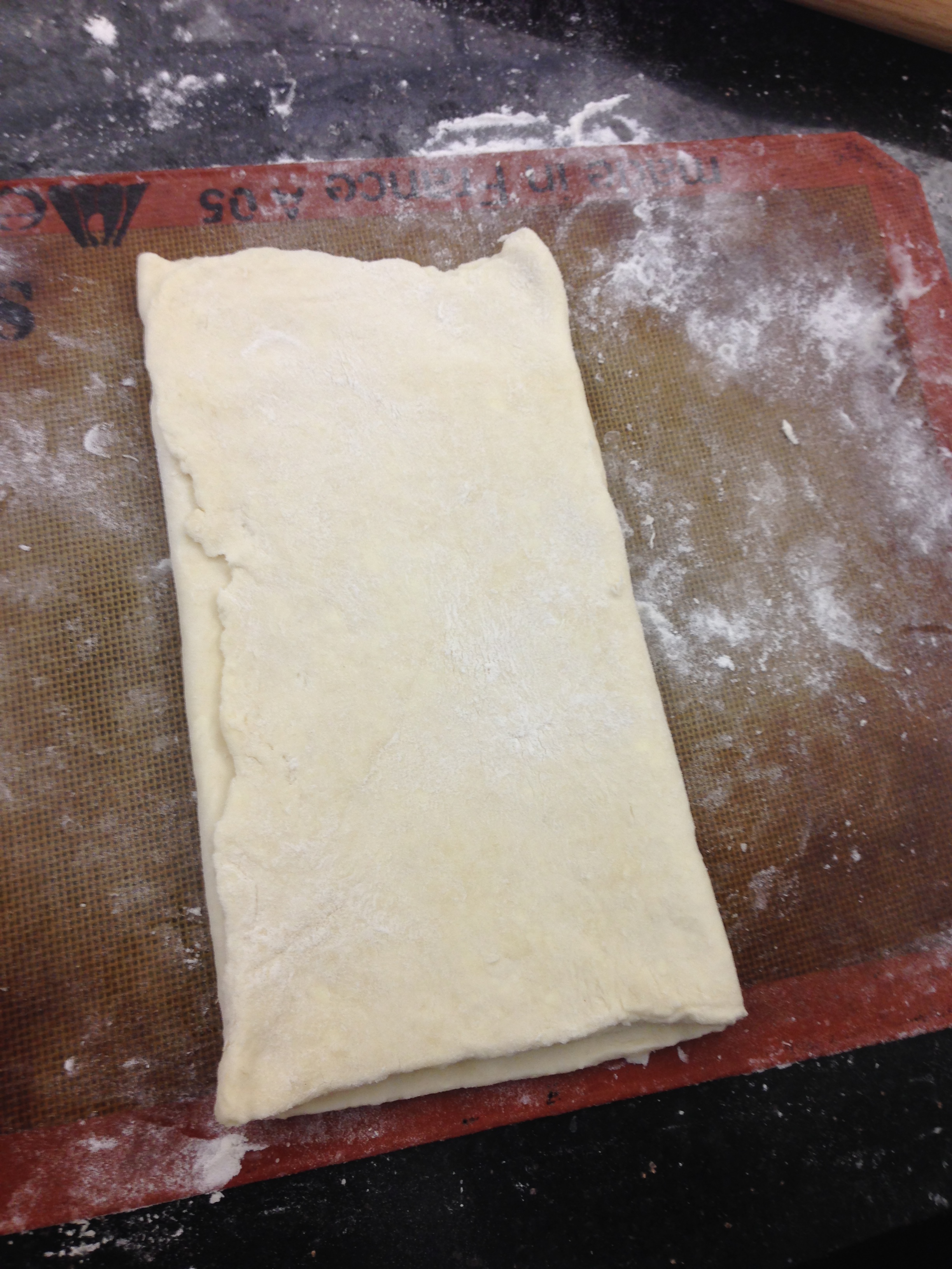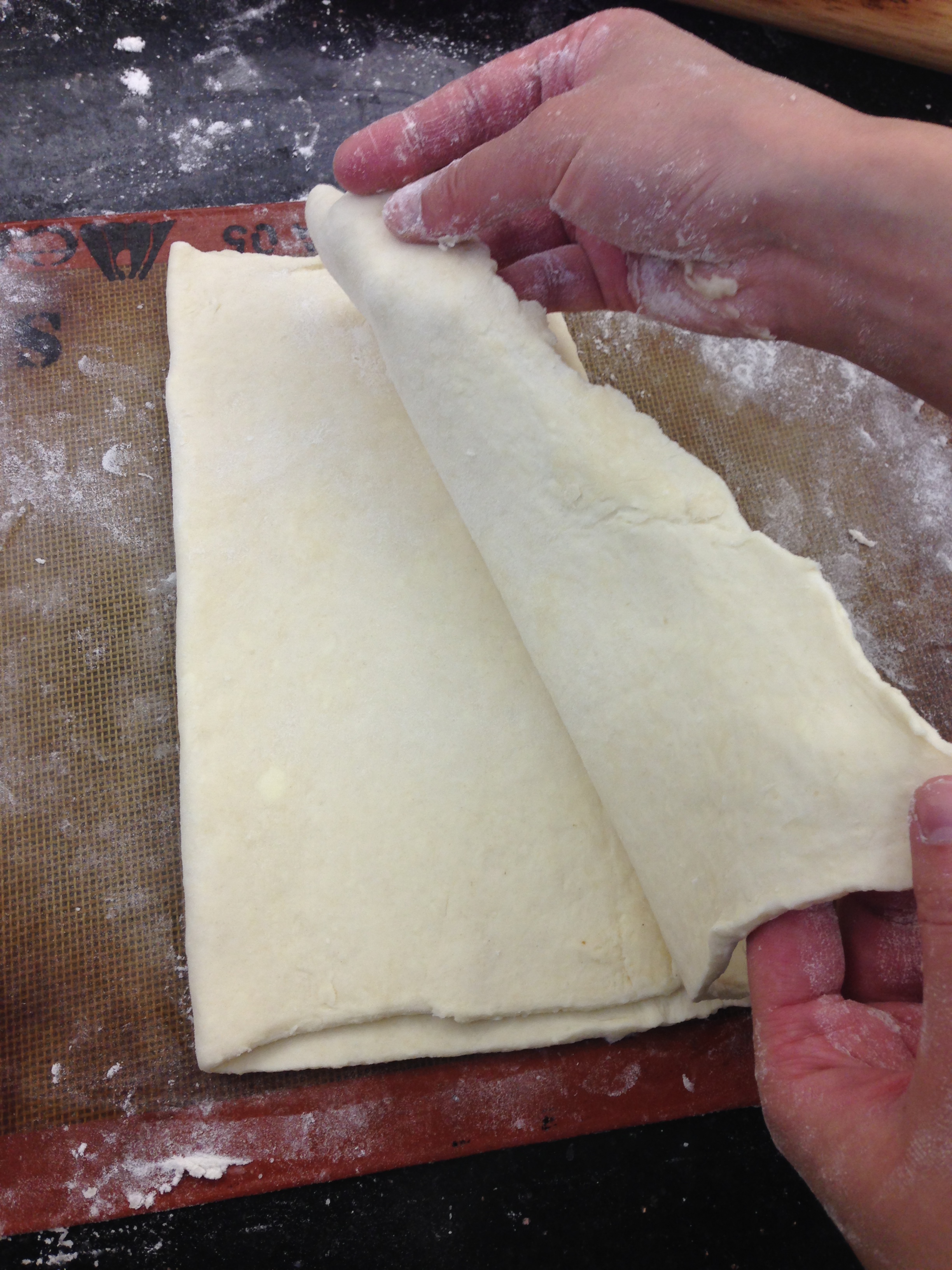 Work with one rectangle of dough at a time. Roll one piece of the dough out into a 12 inch x 18 inch rectangle so that the longest side runs vertically. Then imagine dividing the dough into thirds, lengthwise. Pick up the left side of the dough and fold it over the the middle third of the dough. Then pick up the right side of the dough and fold it over the first fold. The dough should now be one third of the width and it should have three layers of folded dough. Starting with the bottom end of the dough, roll it up tightly all the way to the other end. Pinch the edge closed and place the dough seam side down. At this time, the top should be smooth and the spirals should be visible from both sides of the dough. Use the palm of your hand to gently press down on the dough. Then use a sharp knife to cut the dough in half, lengthwise, i.e. not cutting across the visible spirals. Wrap each piece of dough in syran wrap and refrigerate for at least 2 hours prior to use. You could also freeze the puff pastry (after it has chilled in the refrigerator for at least 2 hours) and defrost in the refrigerator prior to use another day. Repeat these steps with the other rectangle of dough.
