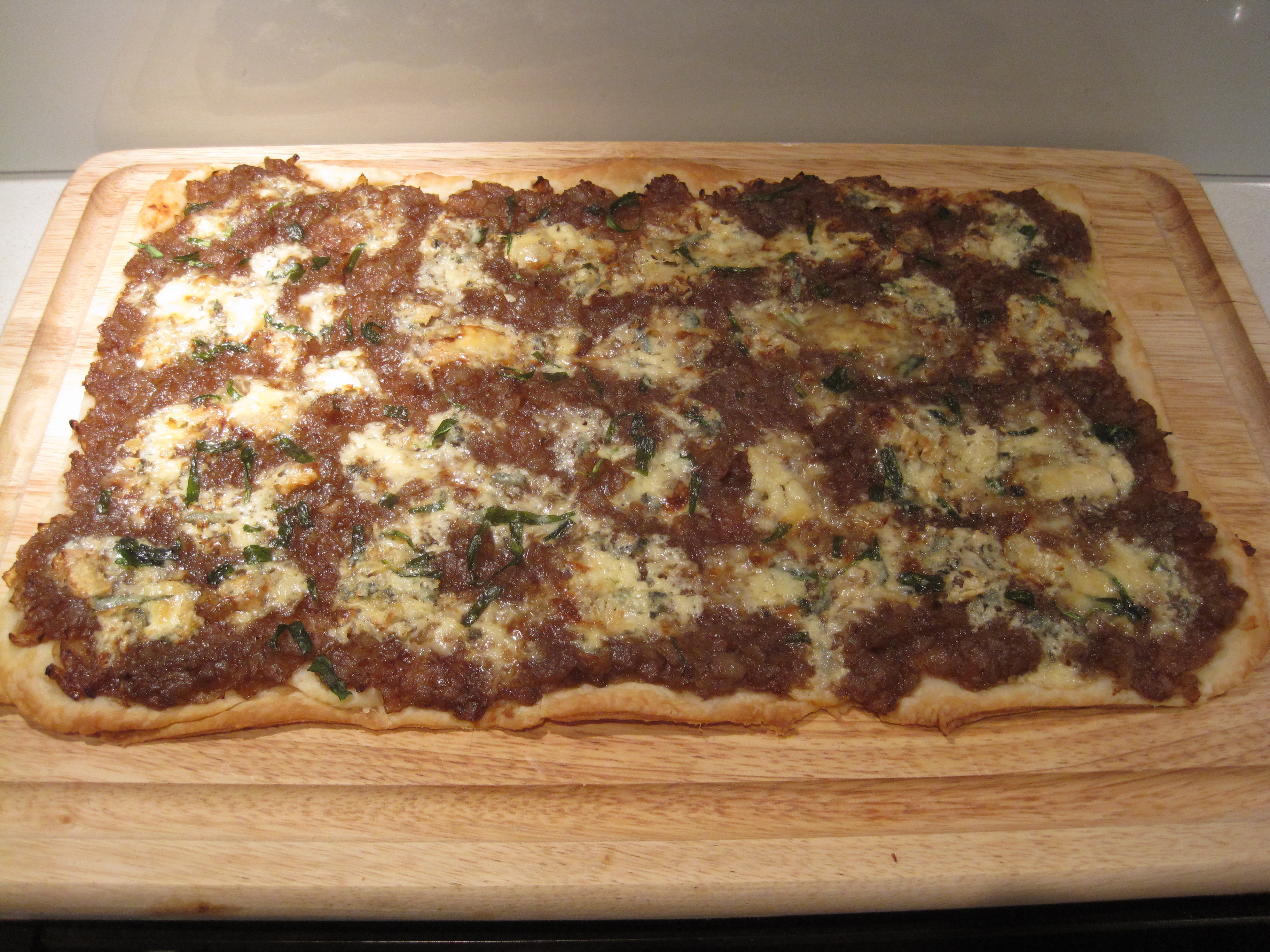 I made caramelized onion and gorgonzola puff pastry tarts for John’s housewarming party.  They were definitely one of the party favourites.  They were also easy to prepare in advance.  I cut them into small squares for finger food, but this tart would make a great first course, too.  If you have the time and patience, you could turn these into round hors d’oeuvres instead.  These would be cute and elegant for any event.  Simply use a small, round cookie cutter to cut out rounds of the rolled out dough, follow the recipe as written, and place the filling onto each round of dough before baking.