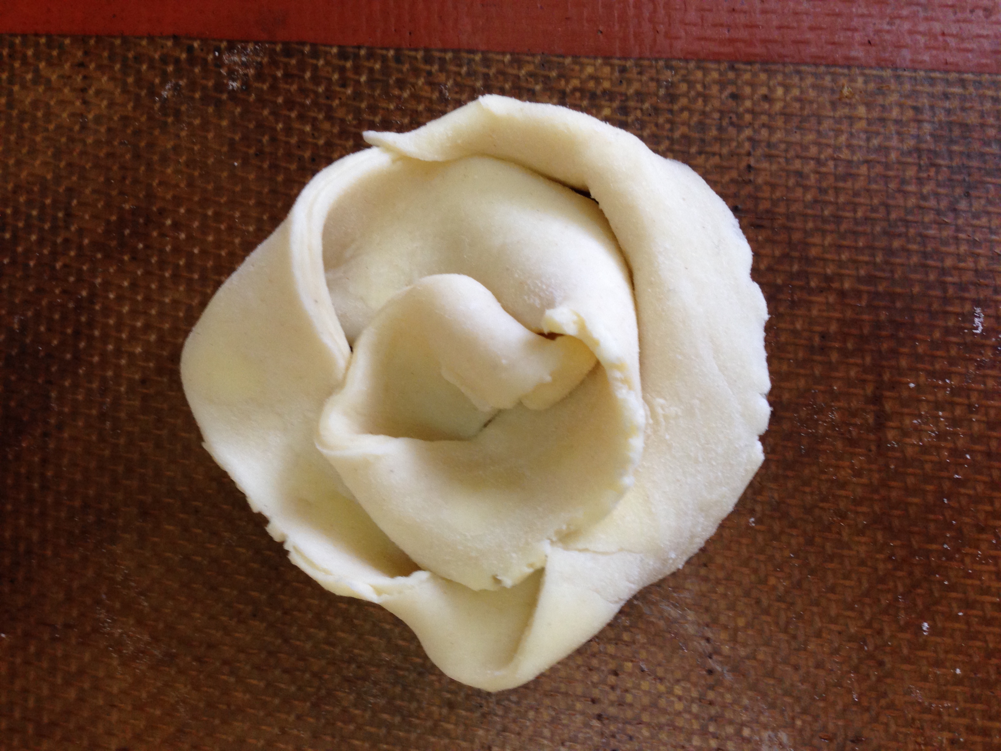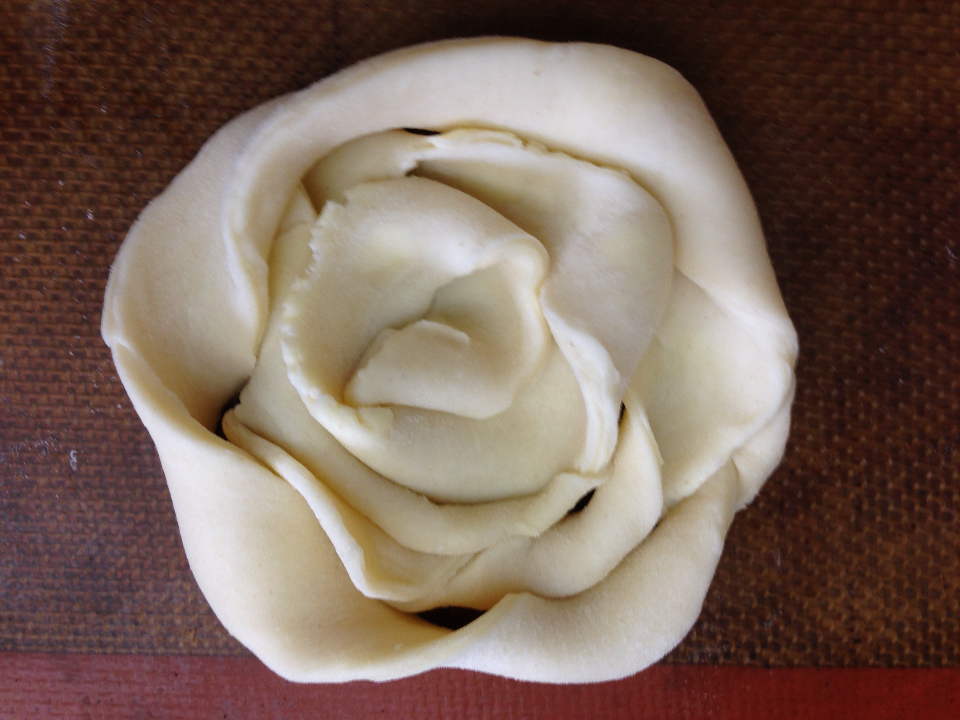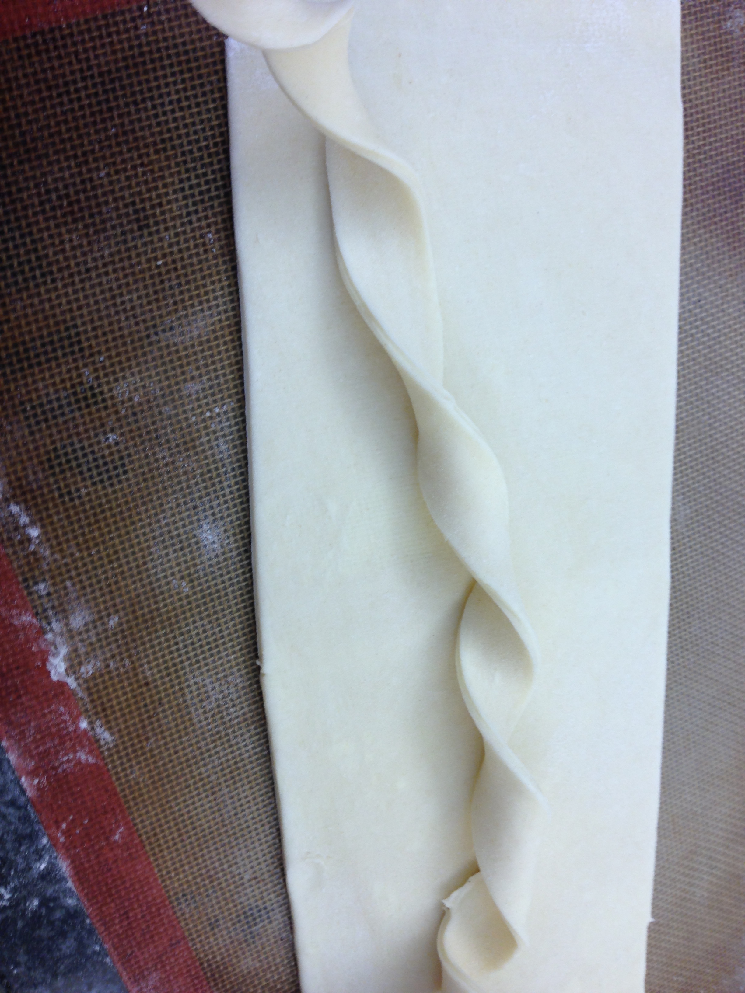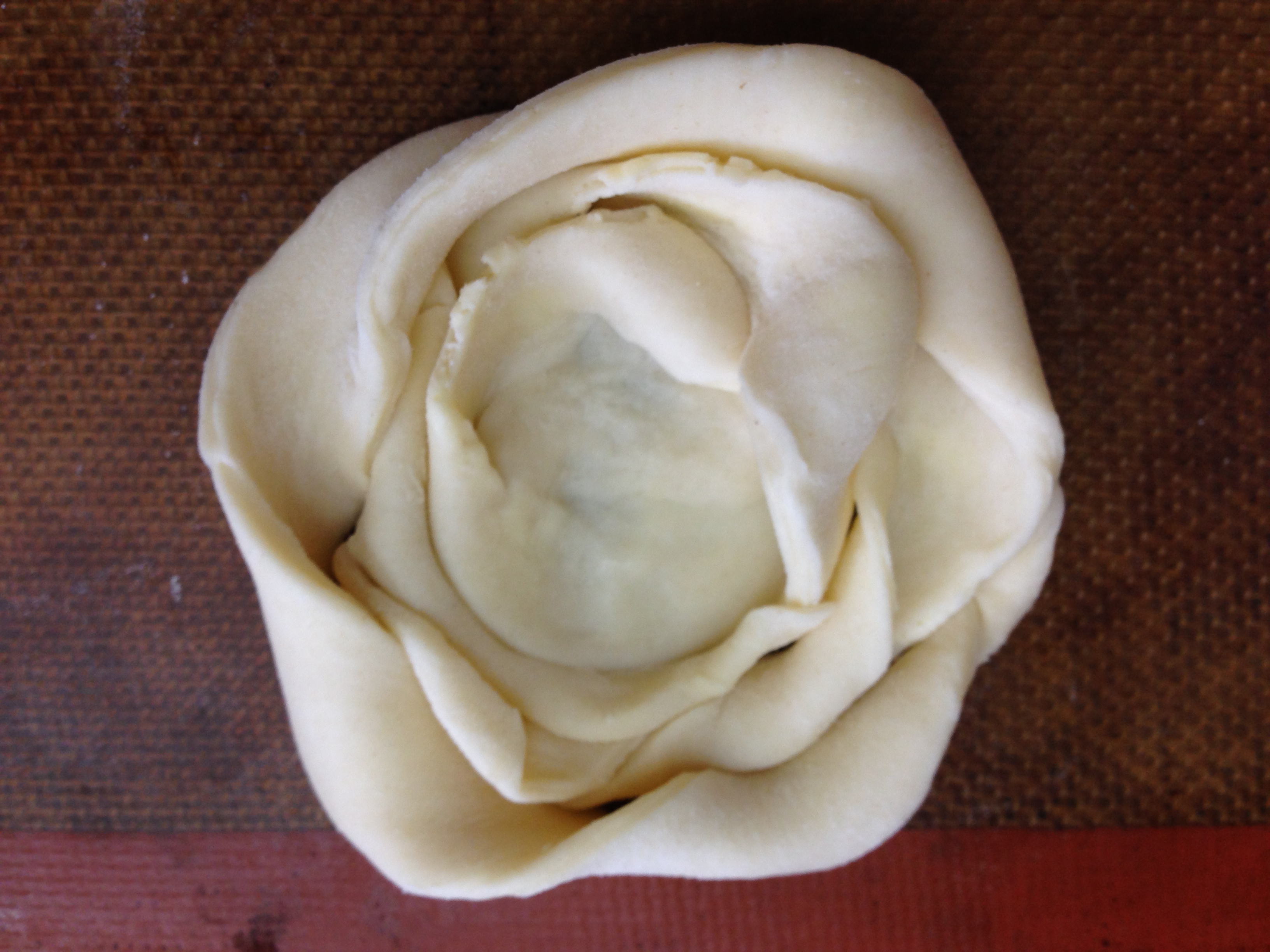 Use a sharp knife or pizza wheel cutter to cut the dough into long strips that are 1/2 to 3/4 inch wide. Work with one strip of dough at a time. Hold one end of a strip of dough in each of your hands and twist the dough in opposite directions to create a spiral. Then coil it around itself on a silpat (silicone) mat lined baking sheet. In the middle of the coil, use your fingers to press the dough down to create a thin, sealed and flat well. Create another spiral using a second strip of dough and wrap this around the first coil on the baking sheet. Be sure to pinch the loose end to another piece of dough, so that the round shape will be maintained during baking. Repeat these steps to create more danishes and place them at least 2 inches apart from each other on the lined baking sheet.