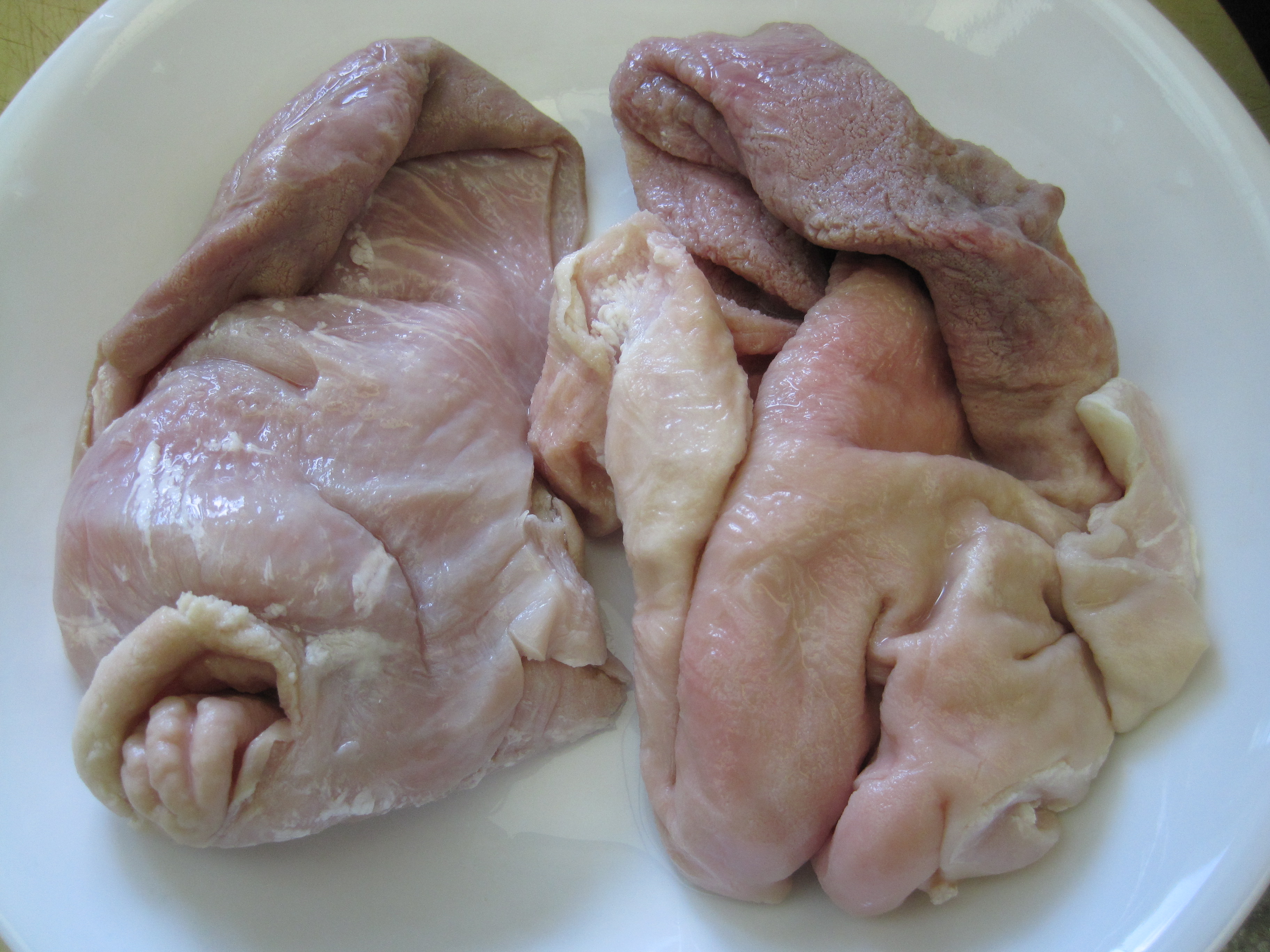 1 or 2 large fresh, not previously frozen, whole pork stomachs (Note: It is important to buy very fresh pork stomachs. They will have an unpleasant odour, but the smell will go away once you wash them properly.)