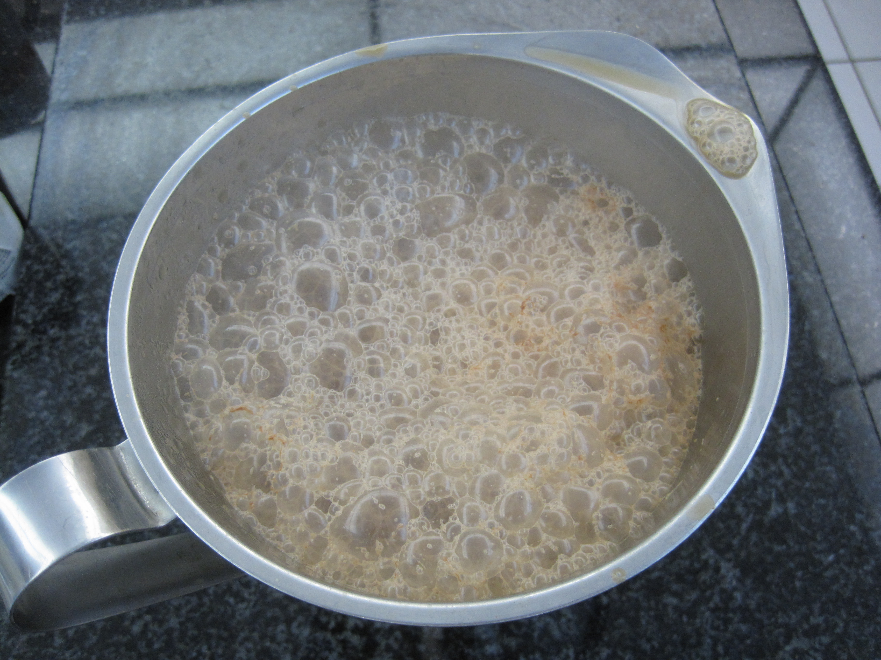 8 tablespoons loose tea leaves and/or tea dust/fannings (Notes: Broken tea leaves (also known as tea dust or tea fannings) are lower in cost and will result in a stronger brewed tea than whole tea leaves. I use a combination of whole tea leaves and broken tea leaves. If want to use tea bags, remove the tea from the bags. If the tea leaves that you are using do not give you a strong enough tea, increase the amount of tea leaves to 9 or 10 tablespoons. In terms of the type of tea to use, try to use a combination of different types of black teas. For a very thorough review of some of the most popular Malaysian tea brands that work well in teh tarik, see here. I used Boh tea. I didn’t like the flavour of Sabah tea in this recipe.)