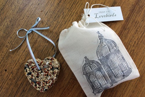 DIY bird seed feeders make great take home gifts for a housewarming party. Photo and tutorial from http://www.polkadotbride.com/2012/04/birdseed-heart-favours-with-free-tags-tutorial/