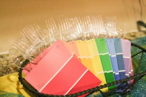 Housewarming party utensil holders made out of paint chips. Photo taken from http://catchmyparty.com/photos/1283931