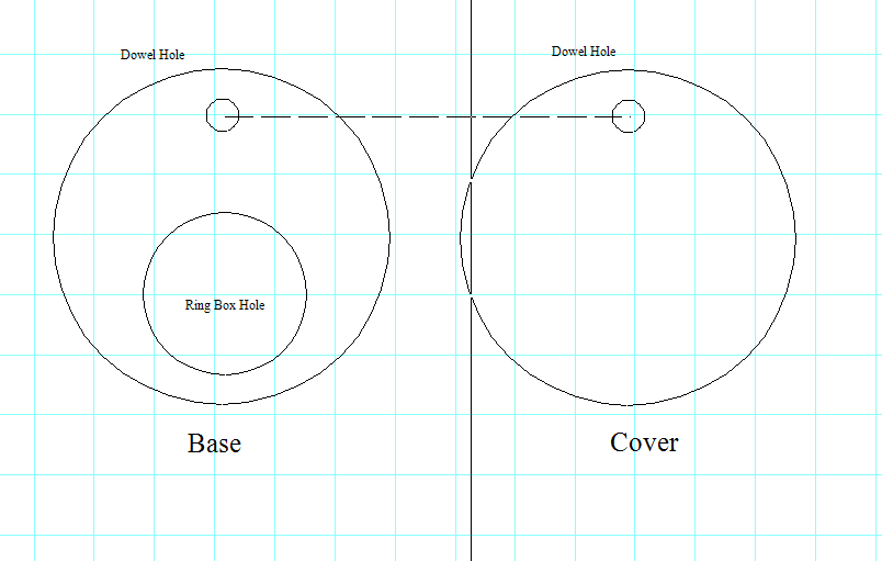 4. Diagram 2Once that is complete, you need to drill a hole into the base and a corresponding hole into the bottom of the lid so that the two pieces can be connected by the dowel.  To measure how big of a hole you will need, I recommend placing the tip of the dowel on the base and drawing an outline of it with a pencil.  You should then find a drill bit that is slightly smaller than the diameter of the dowel.  To get the holes aligned between the lid and the base, you can apply a dab of glue to the location of the dowel on the base of the ring box, and then place the lid onto the base.  When you lift the lid off of the base, you will see a dab of glue on the lid in the spot that you need to drill a hole.  Drill the two holes.