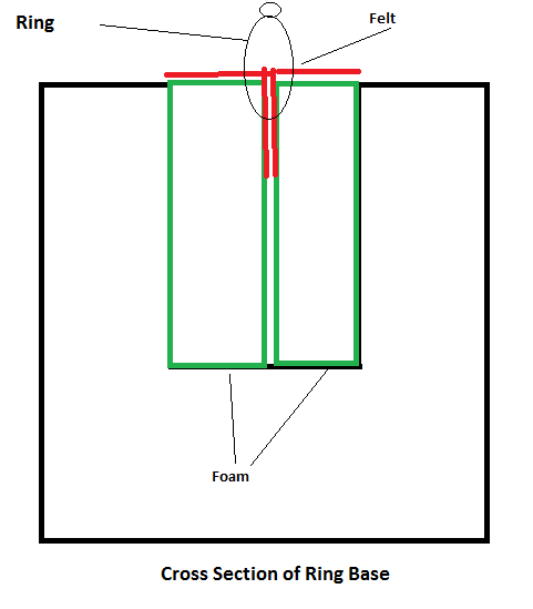 3. Cut a small piece of felt or cloth and glue it over the entire top of the foam pieces, making sure that you insert some of the material into the gap between the two pieces of foam.  The ring will sit in this gap.  (See diagram below of a cross section of the base of the wooden ring box.)