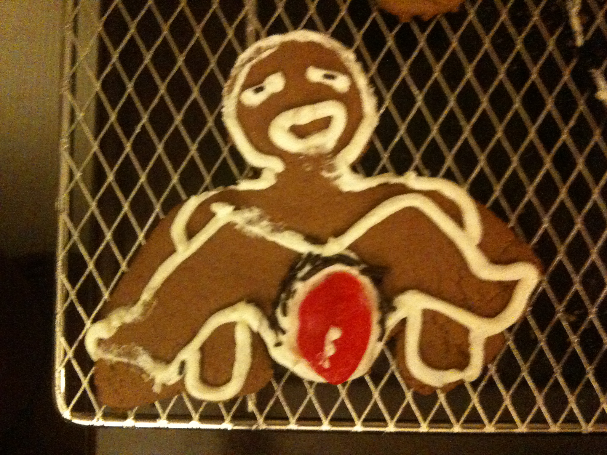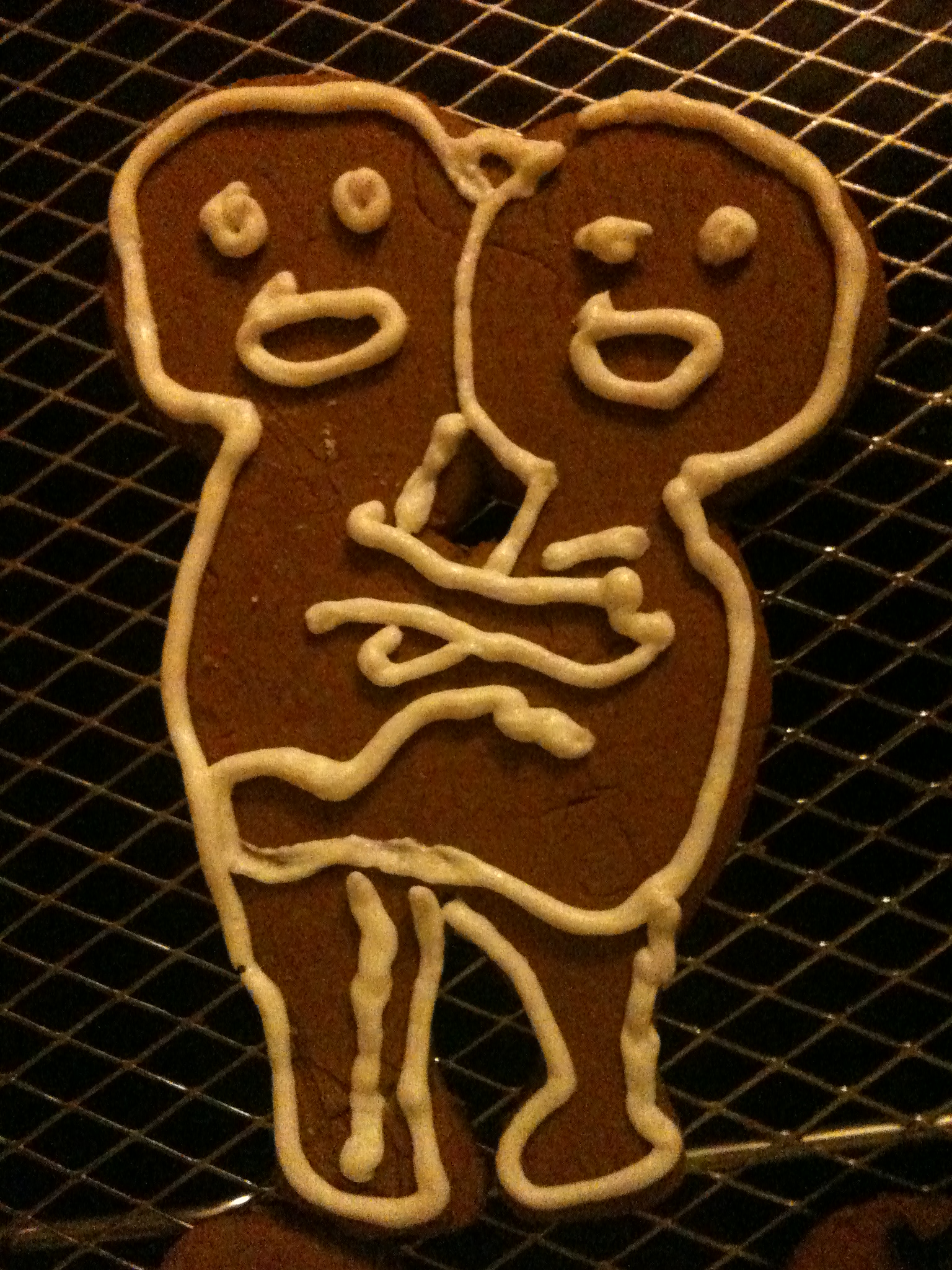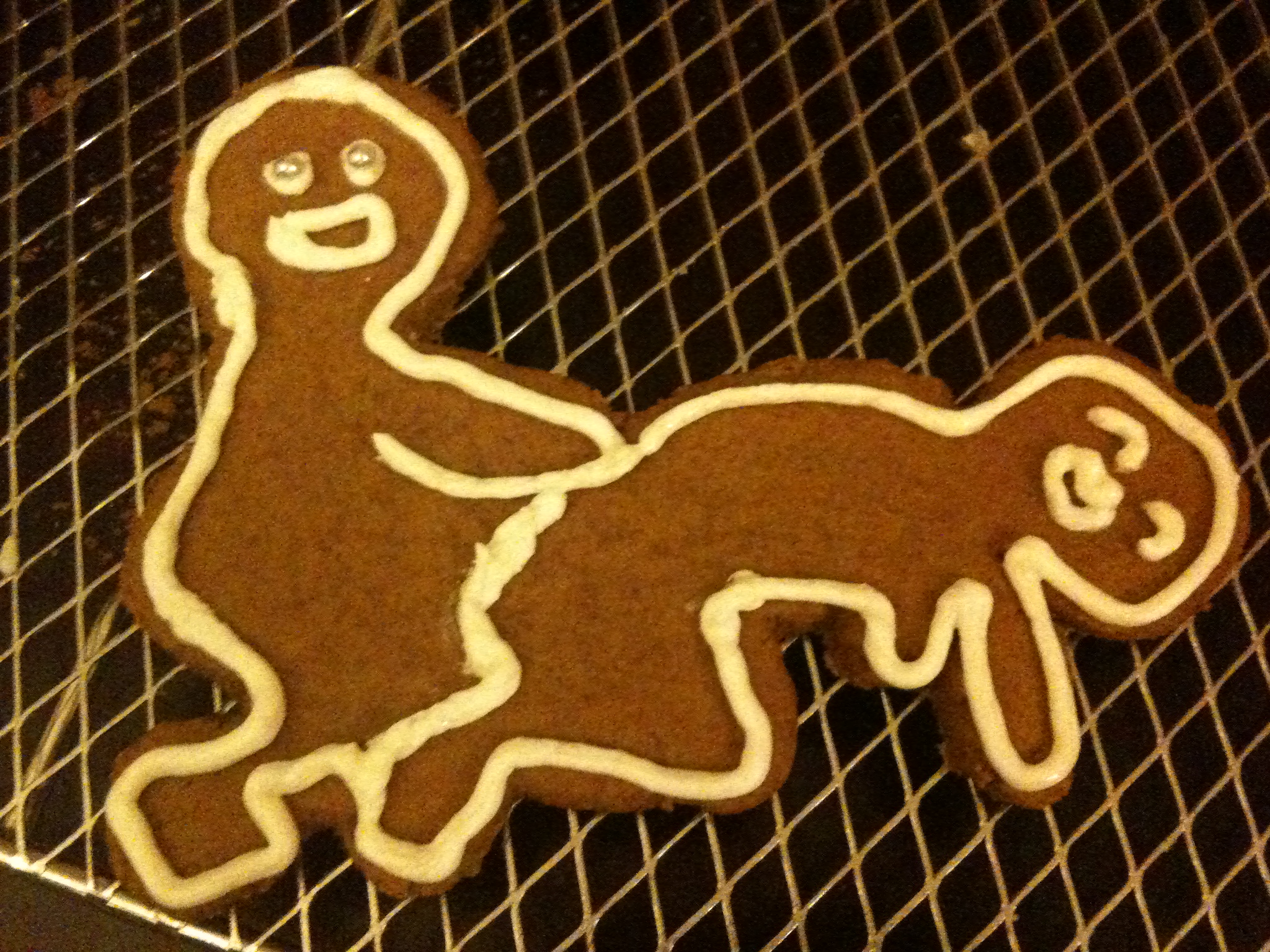 Two years ago, my friend Allan threw a cookie decorating party where we cut out (freehand using a small, sharp knife), baked, and decorated gingerbread people doing naughty things. I’m not talking about the typical gum drop boobies, I’m talking about The Cookie Sutra. It was a lot of fun. Luckily, I can’t take credit for all of them. 🙂 Decorations aside, the chewy gingerbread cookie dough that Allan made was so delicious that it converted me into a gingerbread fan! I ate more gingerbread cookies that day than I ever had in my entire life. That is, until last Christmas when I discovered my new favourite recipe for making crisp and crunchy gingerbread cookies (see here). (See my gingerbread house here.)