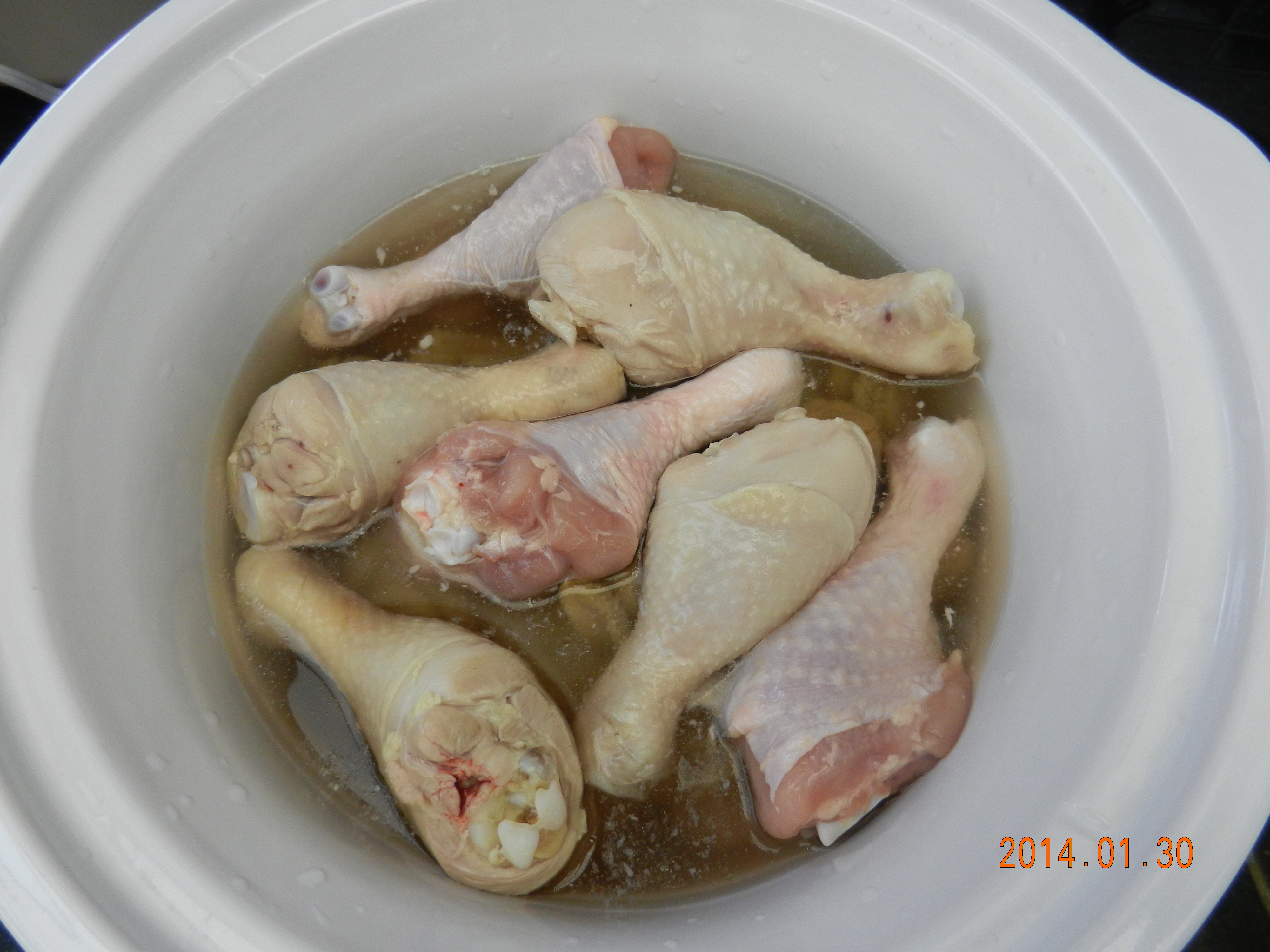 2 pounds (approx.) chicken drum sticks, unseasoned (Note: You could substitute this with other chicken pieces, but whichever parts you use must have the skin-on; the fat from the skin is pertinent to making this dish delicious.)