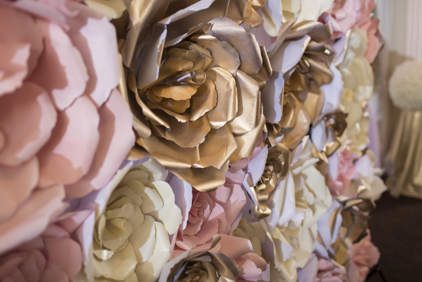 Our head table was a round table on the same level as our guests. We didn’t want to spend a lot of money on decor, but we wanted to rent a unique backdrop for the stage that would make a huge statement for the following reasons: we were getting married infront of it, we had our group photos taken infront of it, it was the backdrop to the speeches and most of the entertainment, and our guests could take photos infront of it instead of having a photo booth. Our custom designed, handmade paper flower wall turned out perfectly – it was impactful, unique, elegant, beautiful, and fun. The backdrop consisted of giant paper roses in three different sizes and three different colours (gold, blush pink, and ivory). Our guests and our vendors (especially the photographers and videographer) loved it, too. Don’t judge Handmade Decor by their website. Be sure to request Zonny and Phuong. They are lovely, kind, and hard-working people that accommodated my particular requests and worked within my budget to make my vision a reality. We could not have asked for a better backdrop.