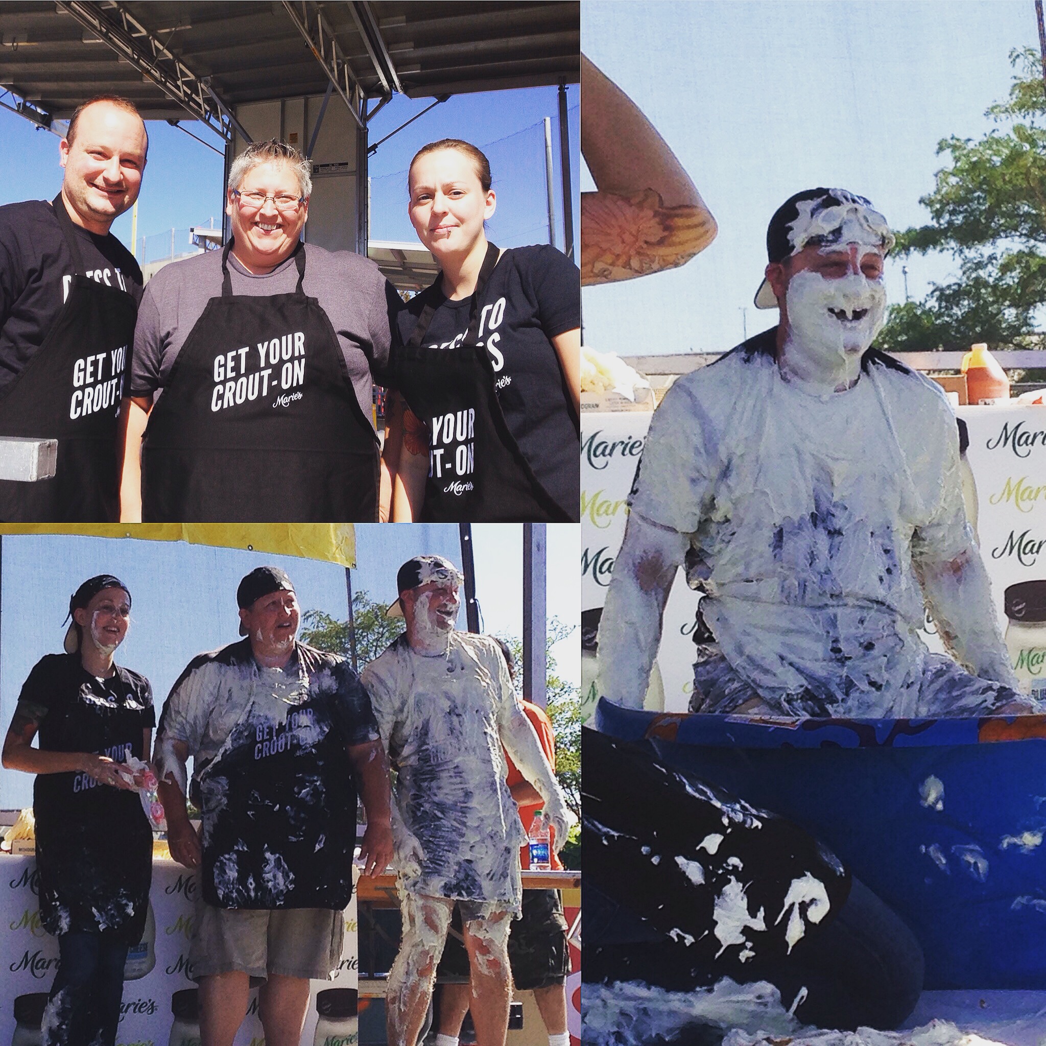In 2016, there were two bobbing for wings competitions. Contestants wear goggles, put their hands behind their backs, and get down on their knees to bob for buffalo wings from a pool of blue cheese sauce. The grand prize is, of course, blue cheese sauce. Last year’s champion flew in from Japan to defend his title (successfully). See Cooking with Alison’s facebook page for short video clips of the competition.