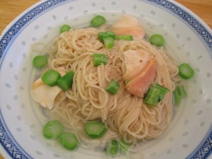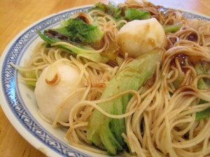 In Rice and Noodle Dishes on October 12, 2010 at amThin, shrimp flavoured noodles are used in various dishes in Cantonese (Chinese) restaurants. They come dried, in little bundles (1 or 2 per serving) and cook just as quickly as instant noodles. So they’re perfect for quick and delicious one pot meals. If you’ve never had these before, I should inform you that they don’t actually taste like shrimp. They have a subtle, unique, and indistinguishable flavour that, in my opinion, makes them addictive. You can serve them in soup (but eat them quickly before they expand and get mushy) or “dry”. Like they do in restaurants, dressing these noodles can be as simple as drizzling with oyster sauce. I usually treat them like healthy “instant noodles”, but this time I fancied them up for dinner. I also like eating these noodles dry with fish balls and boiled lettuce (recipe here).