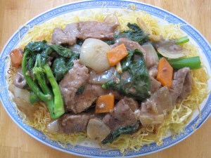 In Rice and Noodle Dishes on September 30, 2010 at pmCantonese style chow mein dishes are very popular in Chinese restaurants. I love the crispy noodles topped with saucy meat/seafood and vegetables. Beef and Chinese broccoli (“gai lan” or “kai lan”) chow mein is just one of many delicious variations. Use whatever ingredients you have on hand. This dish is very simple to make, although it is slightly labour intensive. A healthier and less labour intensive option is to mix the noodles in with the toppings instead of pan frying the noodles separately.