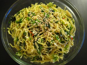 In Rice and Noodle Dishes, Soups and Salads on December 29, 2010 at amThis is an asian inspired noodle salad that Ed loves to eat. Similar versions of this dish are sometimes referred to as “dragon noodles”. It is served cold or at room temperature and is great for picnics or pot lucks. I love the toasted sesame oil but I have to warn you, the noodles themselves are high in calories! You could easily add julienned and stir fried onions, red pepper, carrots, broccoli florets and/or whole snow peas to this if you wanted more colour and texture.