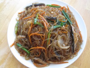 In Rice and Noodle Dishes on August 5, 2011 at amJap chae (or chap chae) is a flavourful Korean glass noodle dish that can be served as a side dish or as a main course. [Note that Korean glass noodles are made with sweet potato starch and are thicker than Chinese cellophane noodles, so be sure to check the ingredients so you don’t purchase the wrong ones.] Enjoy this noodle dish warm or at room temperature (but not cold).